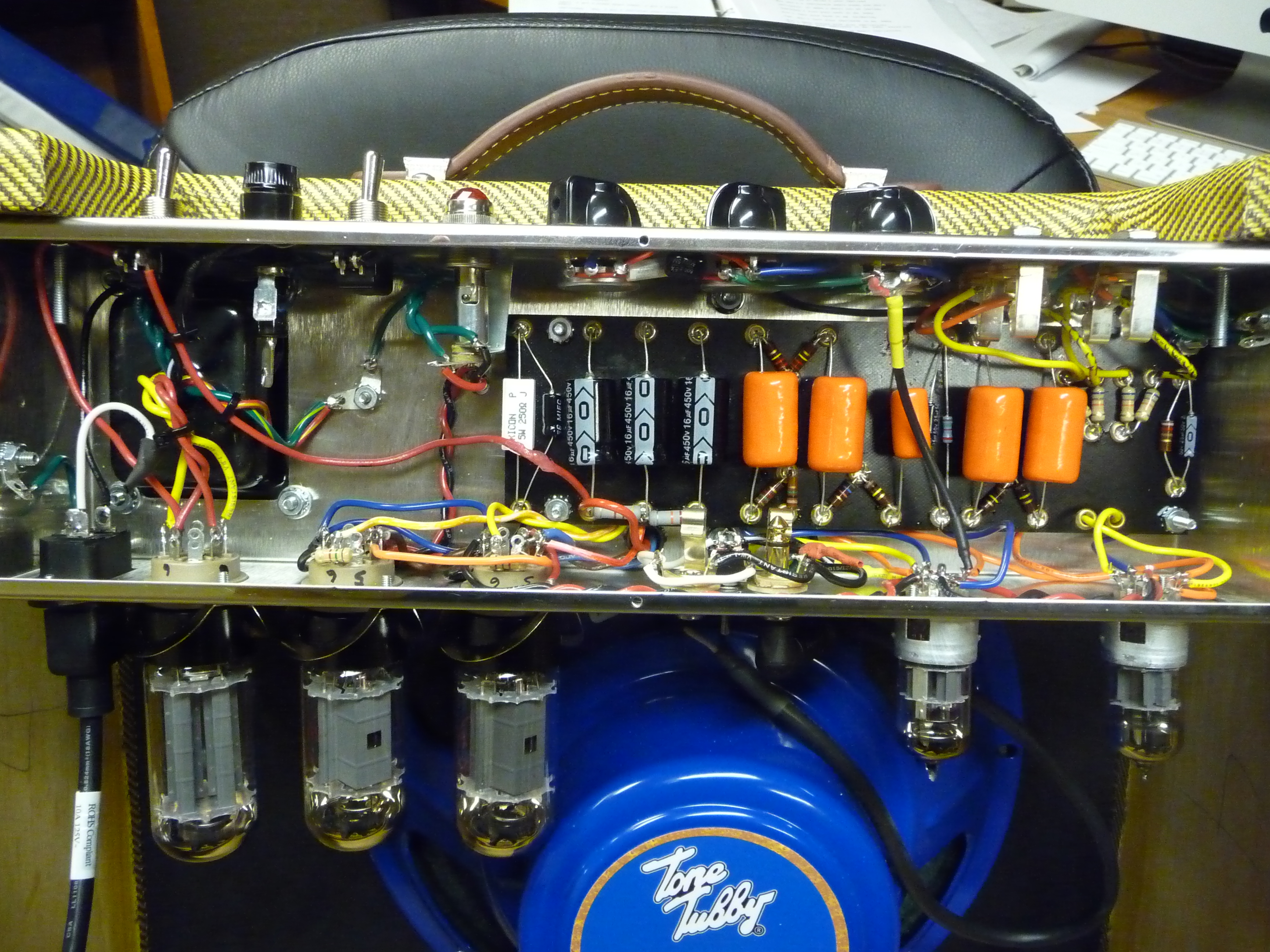 Normal channel has a pronounced hum without an instrument plugged in. Adds a significant hum when turned up while plugged into bright channel. When plugged into normal channel, on Hi input, significant buzz and some nasty raspy noises at moderately high volume. No rasp in the Lo input. Poking around with a plastic implement, yellow wire on pin 7 or V1 is microphonic, as are the yellow leads coming from the 68k resistor pairs. Grounds all seem to be ok for continuity. Before I start remelting things, some wise input would be much appreciated.