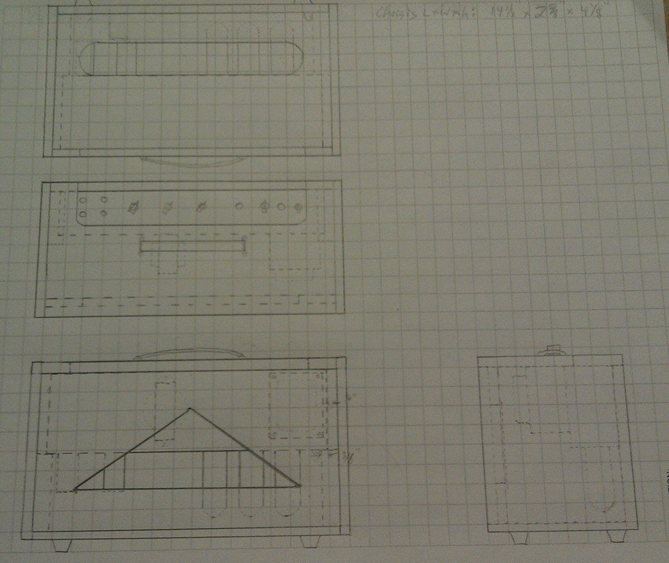 I cranked it to 10 and got weak in the knees. After a decade of digital modeling, I can't describe how pleasant and heavenly this sounded to my ears. My friend could not believe how little hum there was when it was cranked. Time to install the variable voltage reducer kit and design the head cabinet. Now that I had the chassis complete, I could measure it out, prepare a scale drawing for the head, and build it: