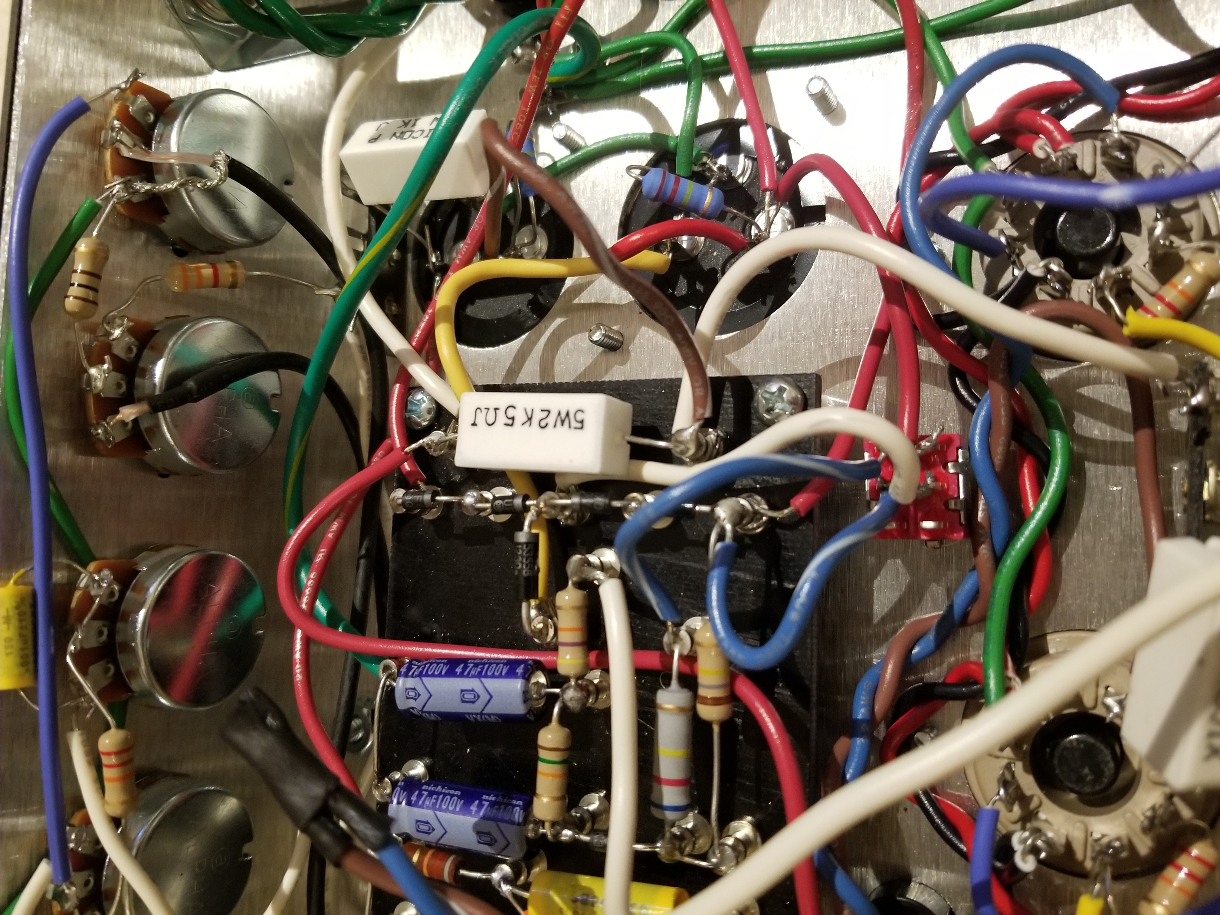 The bias switch layout had me scratching my head for a while. When looking down into the chassis, the "wired" side of the switch is the KT66 side. This allows 2 things...the B+ can bypass the Zener diode since it has a pathy through the switch (i.e. the Zener is shorted), and 2) it engages a parallel resistor (R44) for the bias supply. The no-connection side is 6V6, so when this side is selected the B+ has no where to go except through the Zener, which drops the voltage, and R44 is not added in the circuit. Therefore, from the outside of the chassis, the handle of the switch will be towards the OT when in KT66 mode, and towards the PT in 6V6 mode.