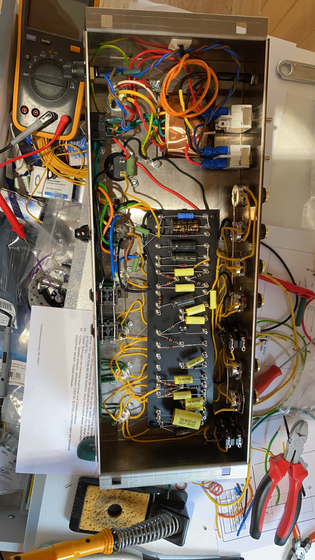 Quick basic question though. All my other builds have the connections to the board off the back, but from the pics of Rotorcraft's build on here am I better off wiring this one from the front for neater wire runs? Photo below is of my 18W TMB built from a TAD kit before I shortened some of the wires, I intend the Triwatt to be neater still. My TMB doesn't have twisted heater wires aside from the set from the PT to the first power tube and is still amazingly quiet (for hum at least!).