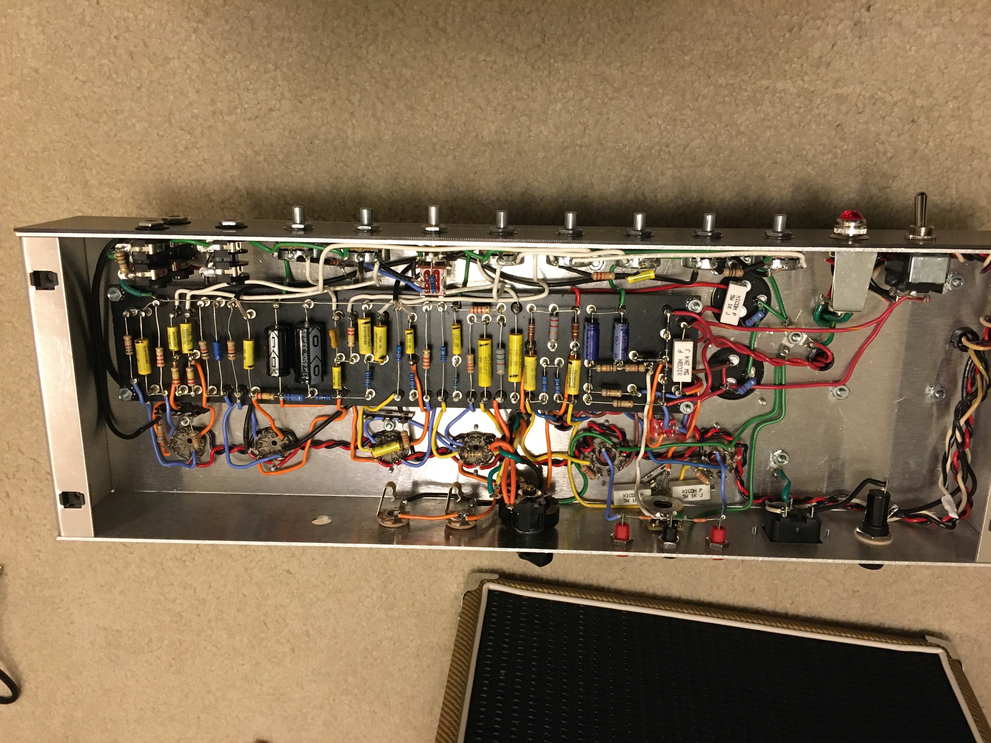 I'm happy to share that after many hours, I completed my Triwatt build on Wednesday! Considering my limited knowledge of electronics fundamentals and the fact that it's only my third amp build (the other most complicated being a 5e3), it feels like a huge accomplishment--especially because it fired up after testing/measurements with no real problems and runs very quietly! There's only