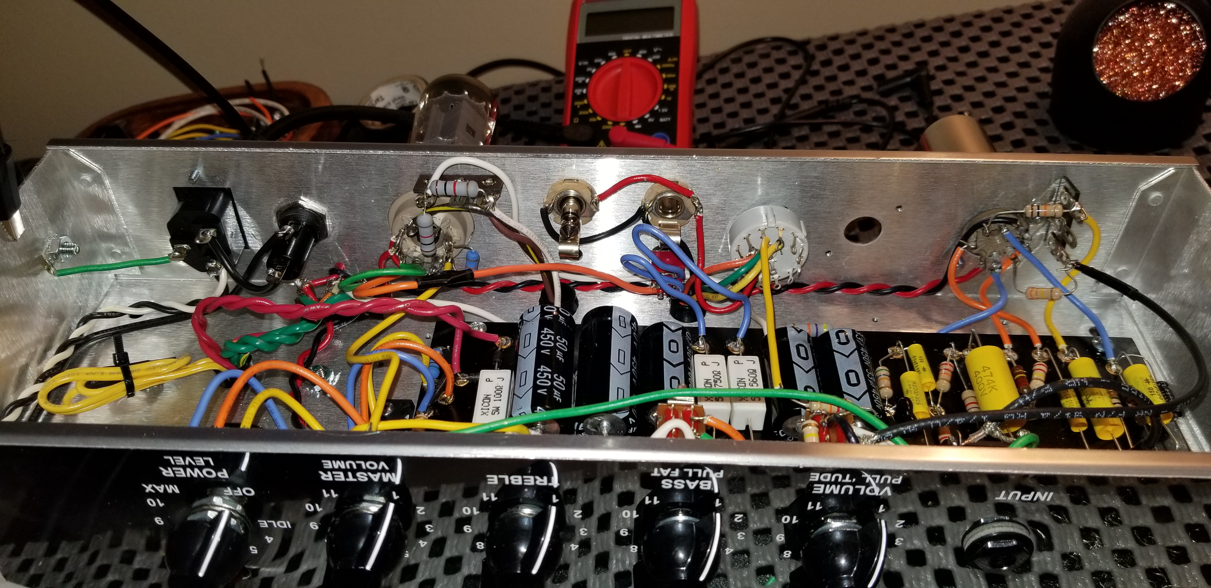 Yeah, everything is working and sounds great! Just have to put together a cabinet now. I had a friend take a look at the layout and I found that I had a couple wires crossed on the power/level pot. I guess that just goes to show the value of having a fresh set of eyes look at something; I missed that even after double checking my connections! Lucky nothing blew up in my face.
