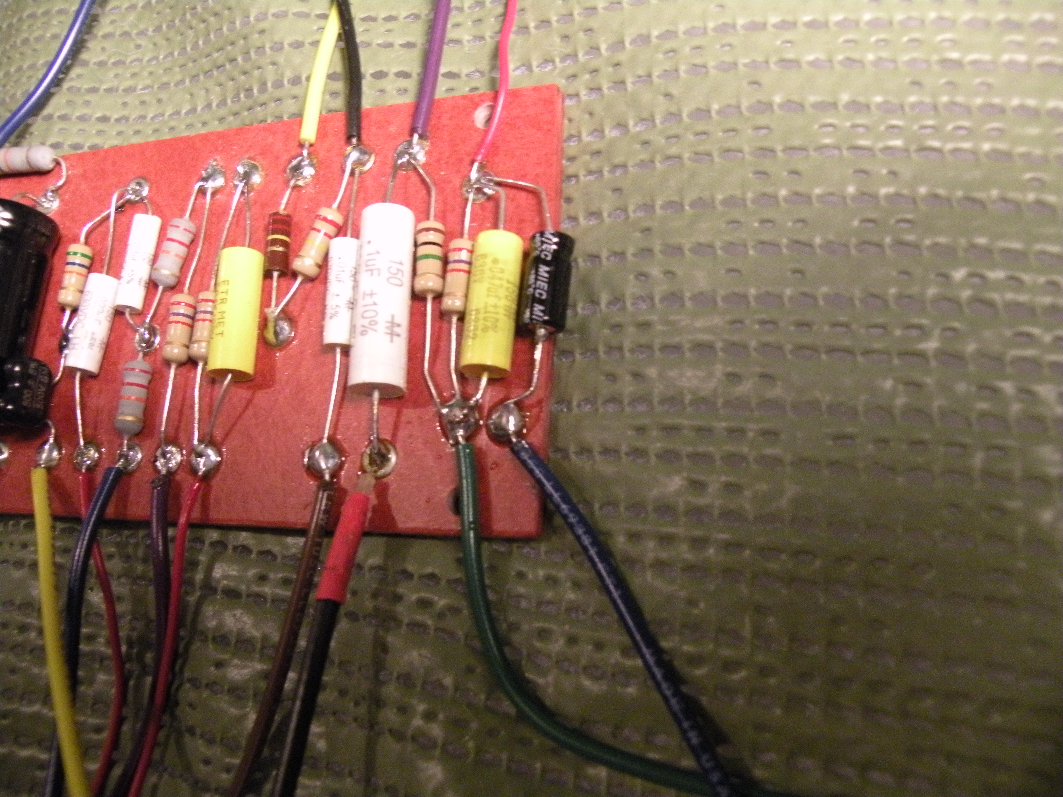 Started populating the preamp side of the eyelet board. I have only done half of this section. I find that it is easier to do a couple components and solder them; then move to the next. As I am right handed this gradual process makes it easier than trying to get the soldering iron in between components. So here are three pictures. The first is the large preamp capacitors and the second shows a couple of smaller capcitors and the two 22k resistors.