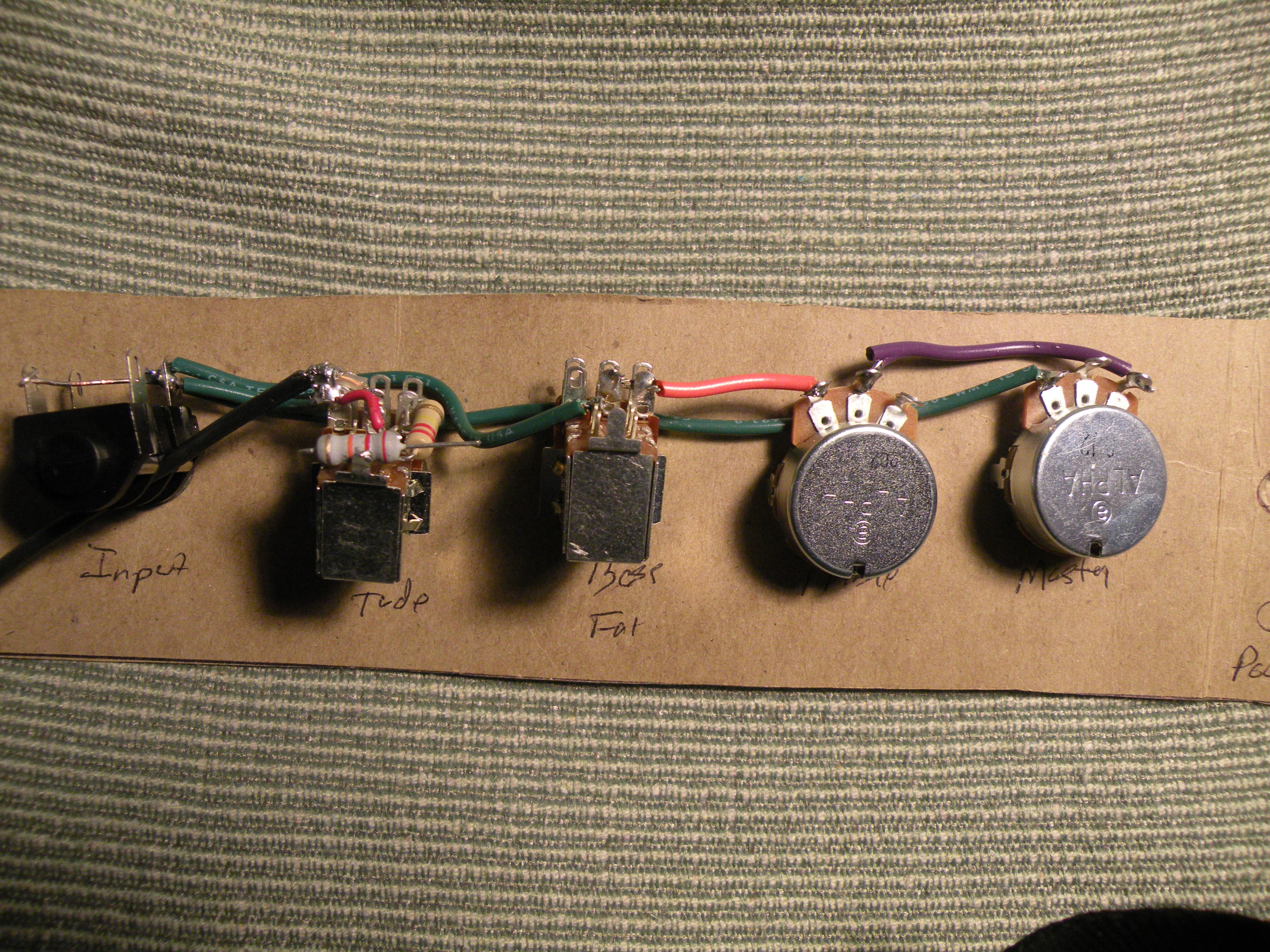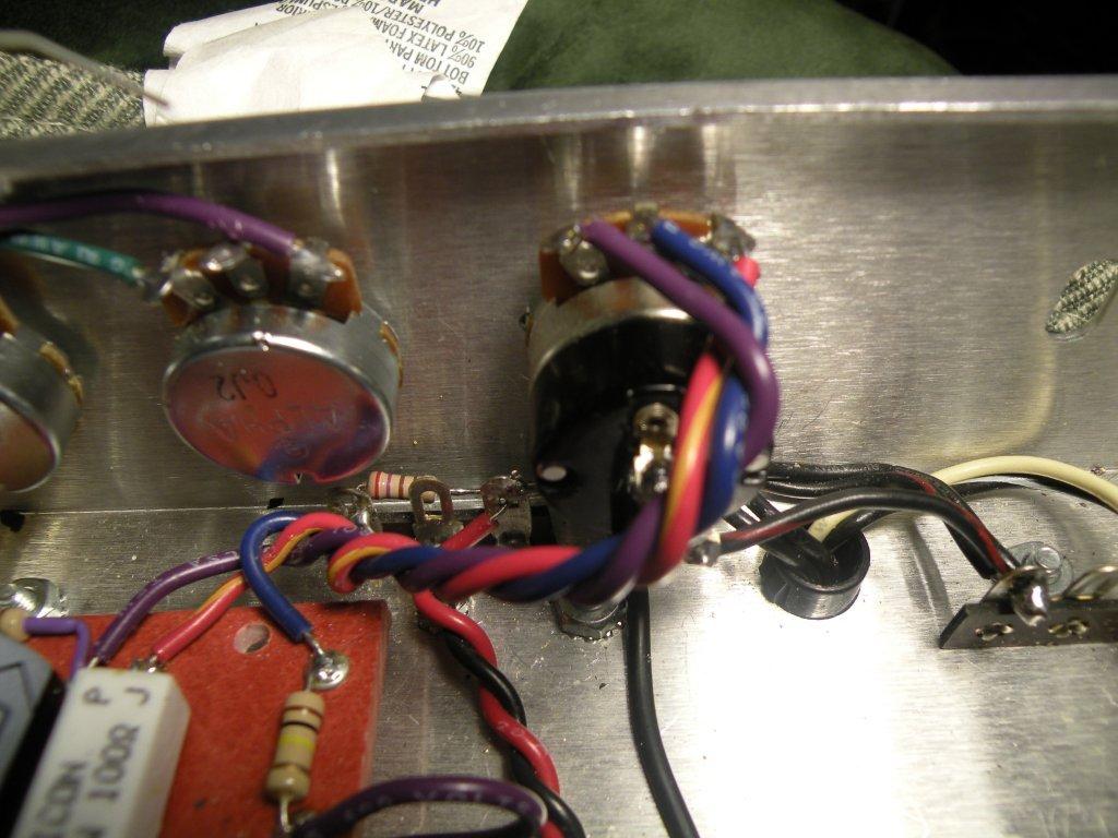 Then I soldered the purple wire from the 22k resistor on the volume pot to the 8 ohm (green) wire's post on the rotary impedance switch. Picture is below.