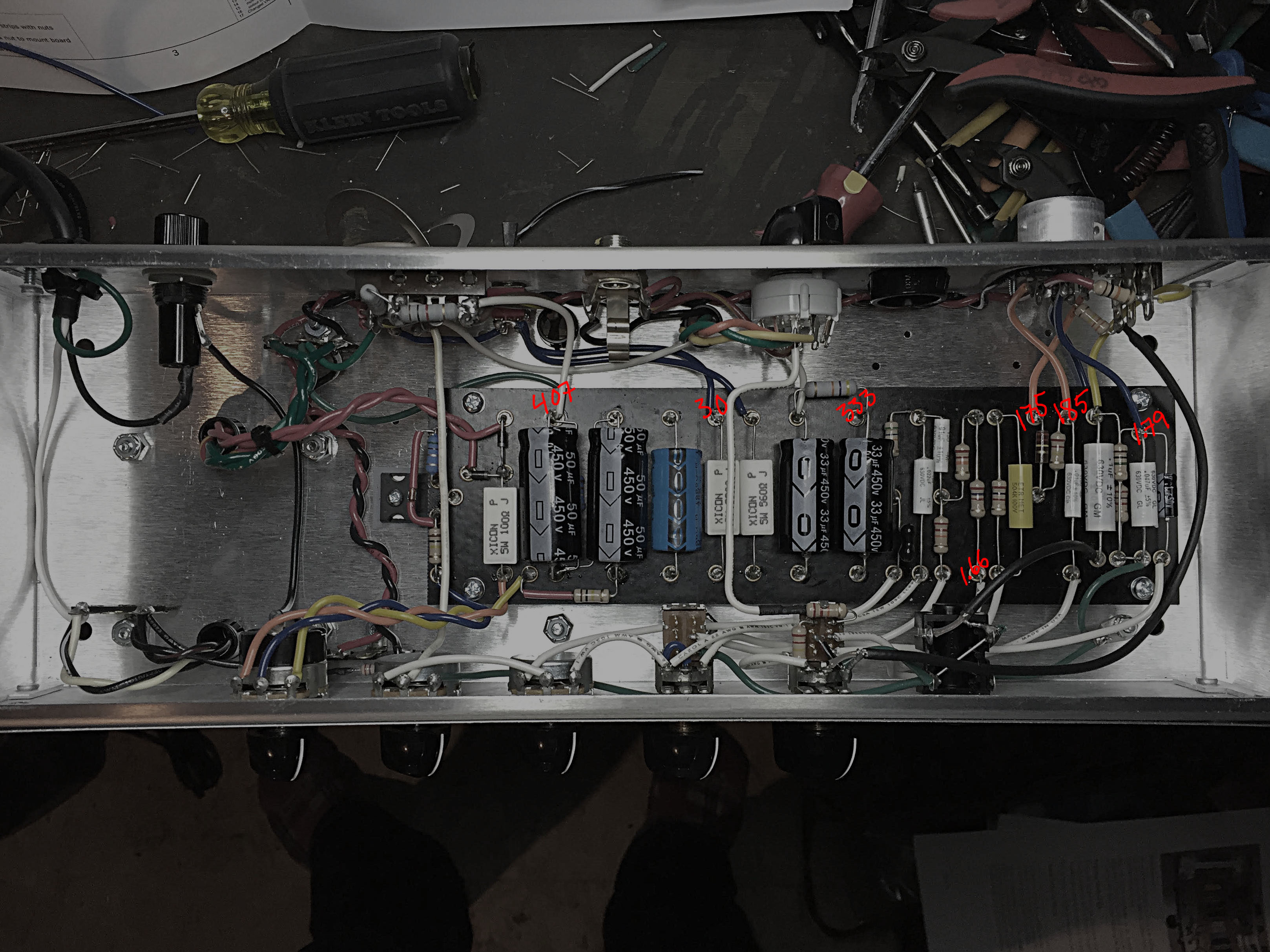 I measure voltage around the board, to match the layout diagram measurements. I annotated one of the photos, some voltages seem low, off the 12AX7 socket.