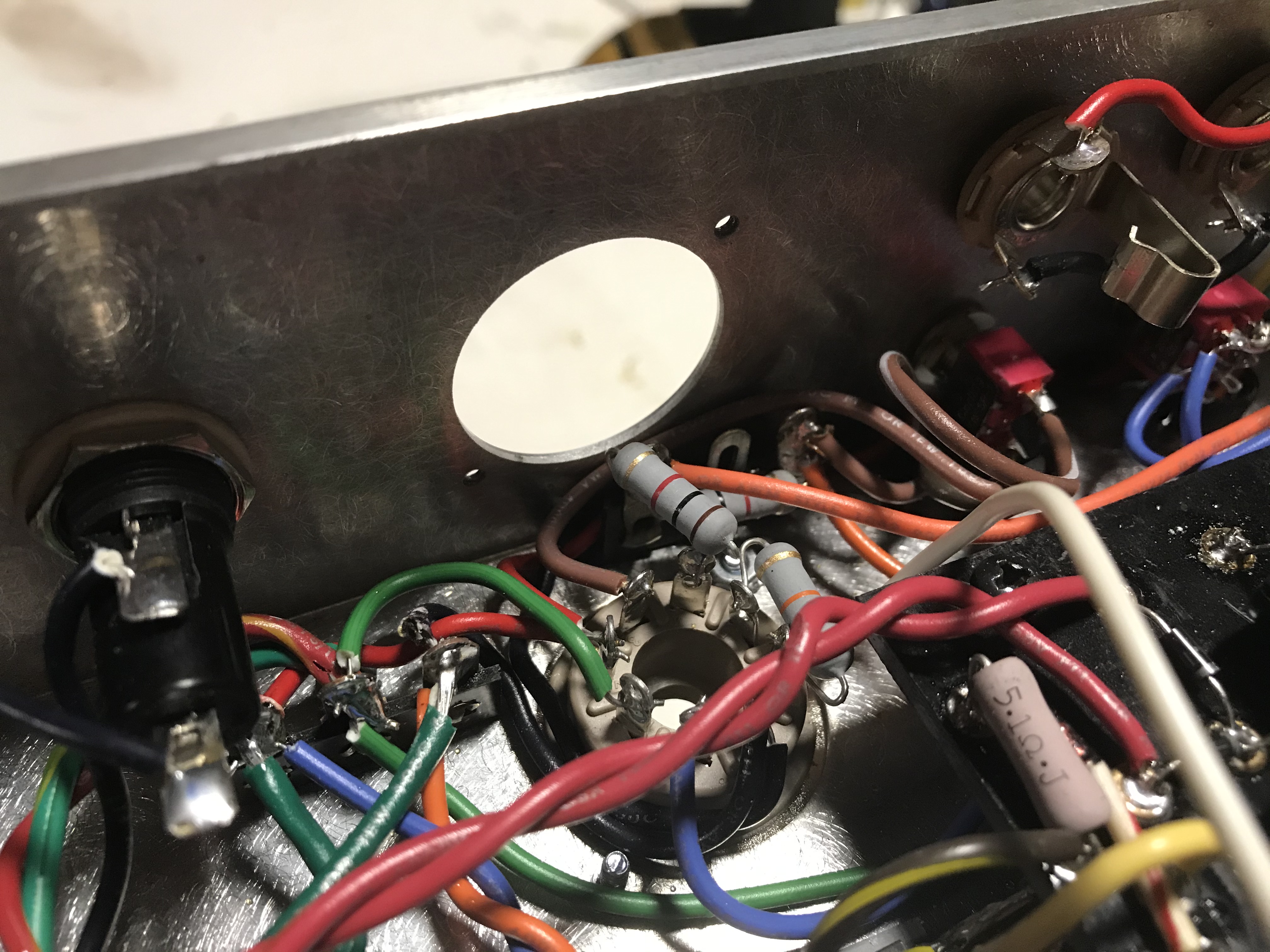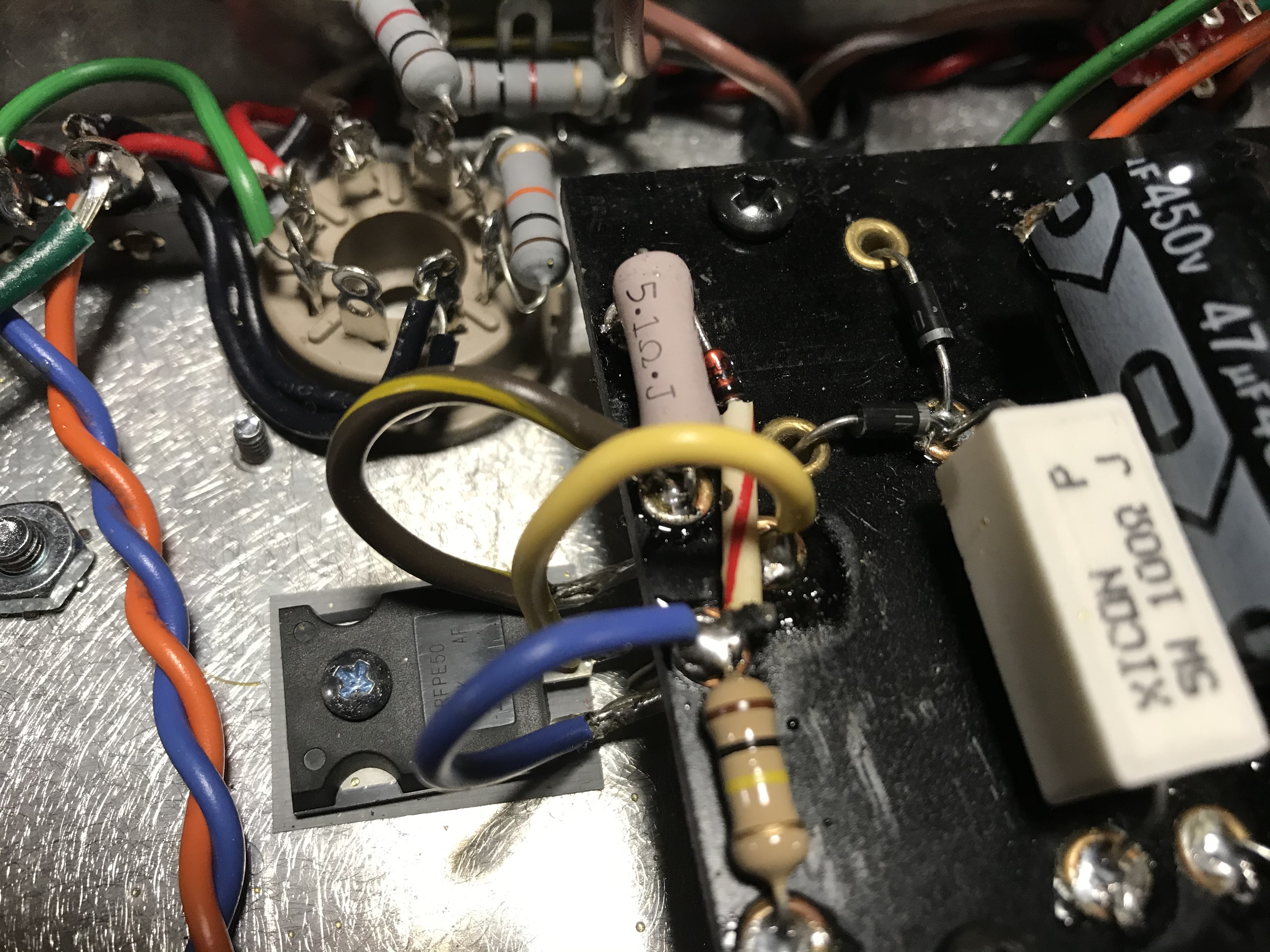 The KT66 mod suggested is to replace the 560 ohm resistor with a 1kohm. So I did that onto the board. But then I wired a 1k5 ohm in parallel with it to a switch so that when the switch is OFF, it is 600 ohms (close to the original 560). But when the switch is ON, it does nothing and only the 1k is active for the KT66.