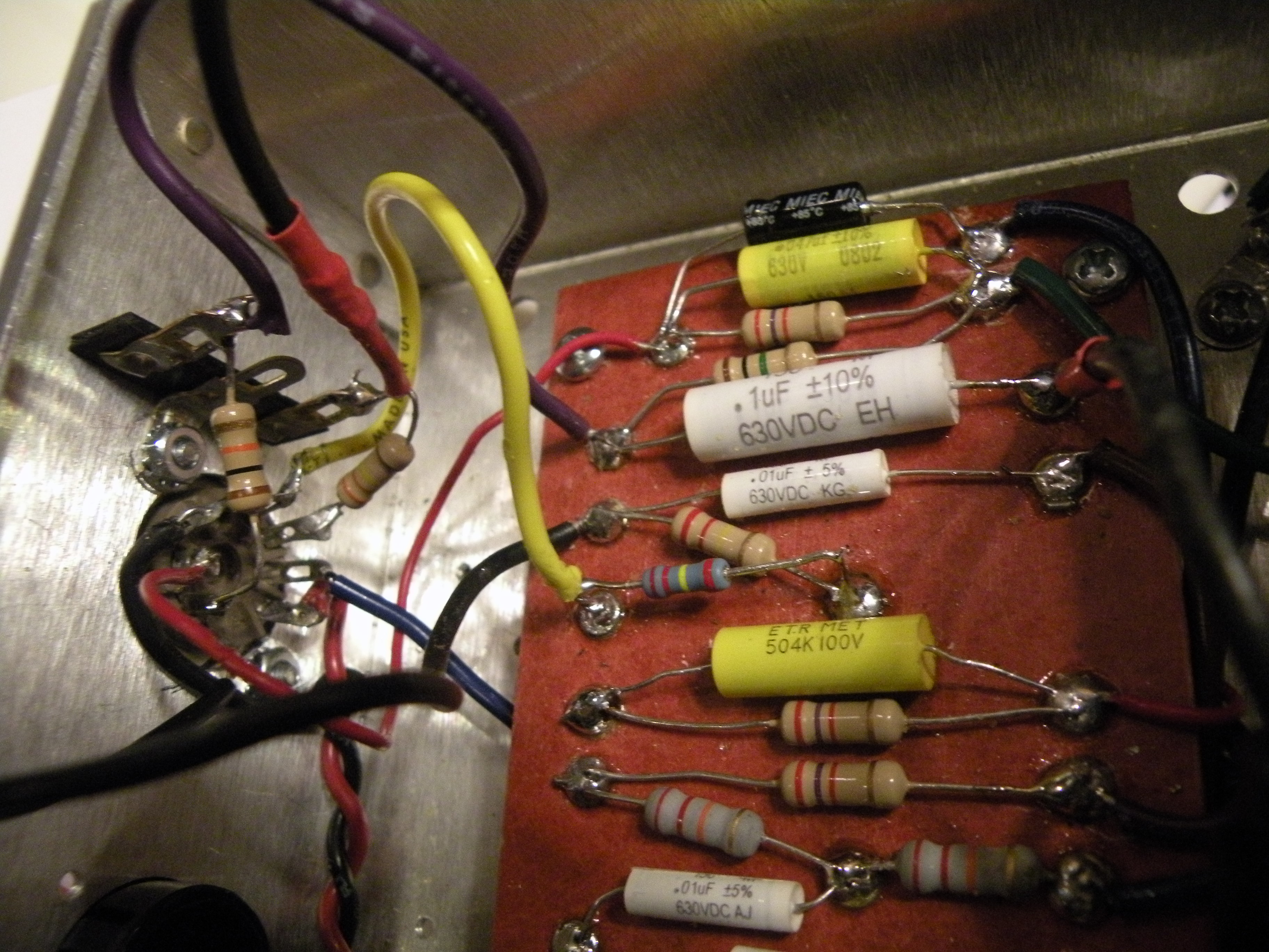 :? :?: However, I get NO SOUND from the input jack. No buzz when I touch the copper tip wire with my mutimeter probe. There is no buzz when I touch the input jack side of the .1uf capacitor that is in line from pin #7. However, there IS BUZZ when I touch the preamp pin#7 and both before and after the 330k resistor; there is also buzz when I touch the preamp tube side of that .1uf capacitor, but NONE on input jack side of that .1uf capacitor.