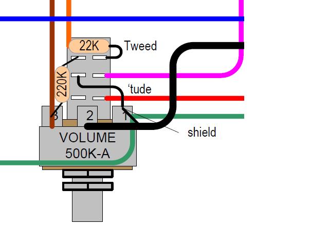 The shielded coax cable (coming from the lower terminal of the strip next to the 12AX7 socket) going to the 500K push/pull volume pot: my first impression was that the coax cable was connected to terminal 2 of the volume pot and the shielded cable (obviously) connected to the middle-left terminal in the diagram (terminology fail :shock: ).