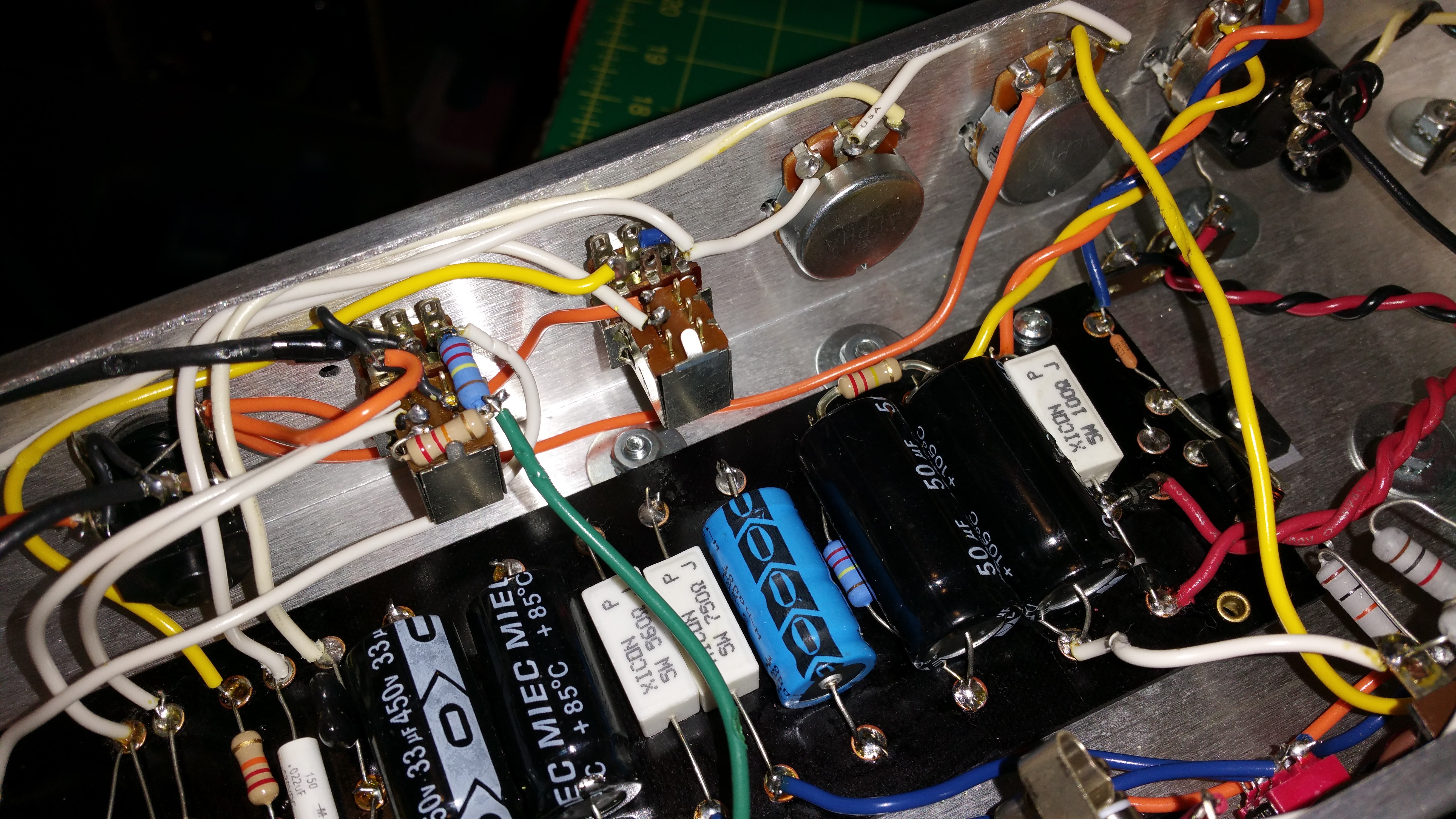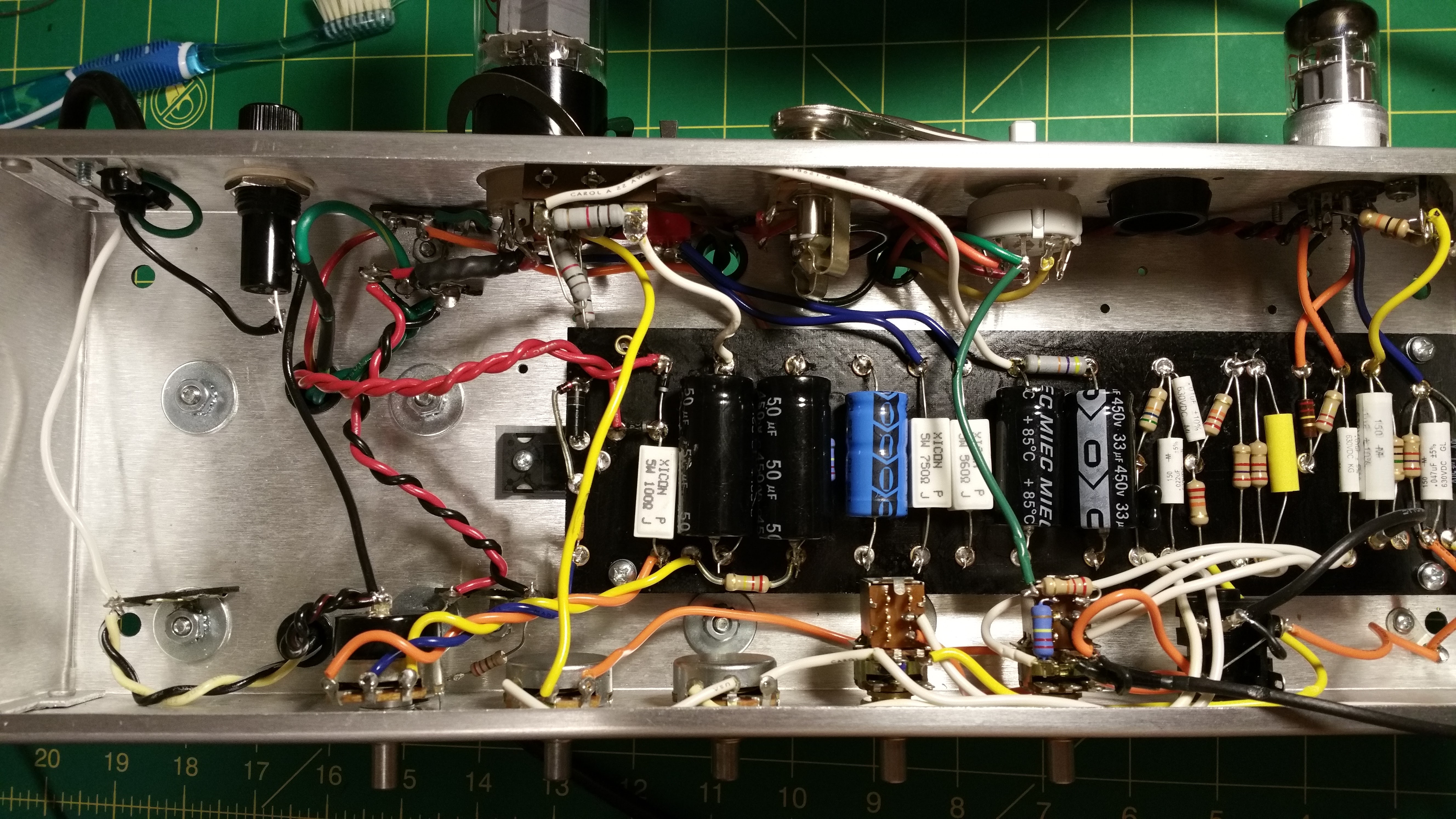 ). It's my first build, and I've made a few mistakes in the process, so I would appreciate any feedback from those of you with more experience. I ended up replacing the MOSFET and its associated resistors because I fried the first one de-soldering. I was an idiot and soldered it before placing the board, so of course it didn't line up. The replacement resistors are exactly the same spec as the originals, just wire wound FYI. I should also note that I'm using a Tone Tubby Humboldt 10" 8ohm as the speaker and a JJ 6v6 as the power tube. Here are some pics: