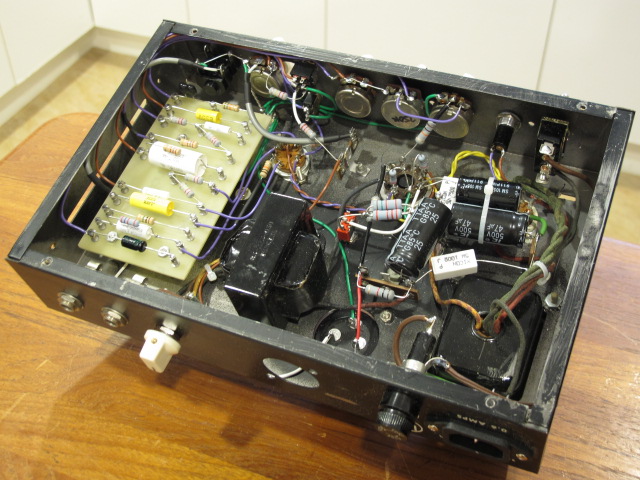 Here's what it looked like when I got everything wired up. Because of the cramped chassis and less than optimal layout, it's not the neatest amp I ever built but it works!