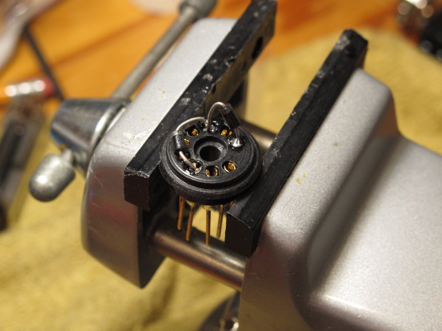 The Bogen originally had a tube rectifier using a EZ81. I left the wiring for it in place but I could only get about 340 volts out it. The Tramp circuit calls for 400 volts for the B+. It also uses solid state diodes which are more efficient than tubes so you get more voltage. Rather than wire in a couple of diodes, I made a little plug-in solid state rectifier to replace the EZ81. I used a couple of tube socket extenders and wired two diodes to the pins inside.