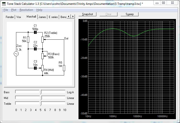 Here is a snapshot of the TSC for the tramp. It is a modified Marshall stack. Mod the mids if you want to change the two 22K resistors.