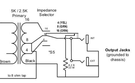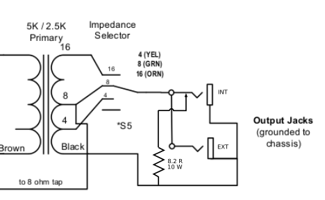 The idea is that if the speaker is unplugged, the shunt tip in the output jack connects a resistor in its place. The resistor is downstream of the impedance selector switch, so it's only a good impedance match when you're on the 8 Ohm setting. I decided that putting it upstream of the switch wasn't worth the extra complexity. For completeness, here's what I think the "upstream" version of the circuit would look like: