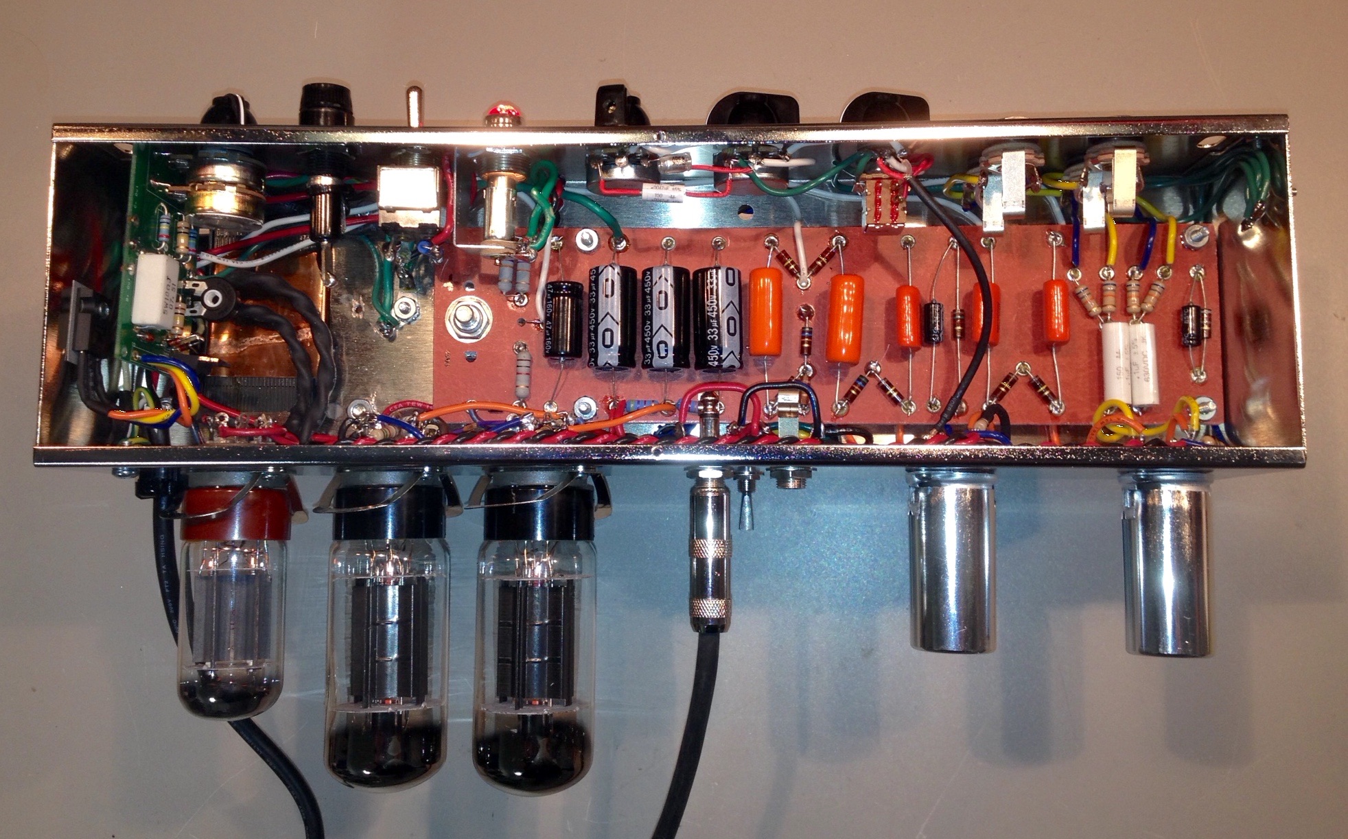 Pictured is a custom amp built for Bernie O'Connor of Kingston, ON. He liked Jason Fryer's Trinity Tweed and wanted one with more power and extended headroom. So this started out as our Tweed 5E3 circuit then we added 6L6 TAD power tubes, huge Heyboer Power transformer to supply over 400 VDC and matching Output transformer. It is a fixed bias amp with a Power level control to dial down the volume in smaller venues. The power control fits into the left slot where the stand-by switch was. The power switch is a progressive OFF- STANDBY-ON type we use on our TRIWATT. As a bonus, we added a pull pot switch for a Fat control on the second gain stage and extra buffering to smooth out the overdrive. This should be a killer amp and we're looking forward to hearing Bernie play it soon. The cabinet is a mahogany stained pine unit with satin finish and with a natural cane grill cloth. The speaker is a Tone Tubby Alnico Red. More pictures of the finished amp to come soon.