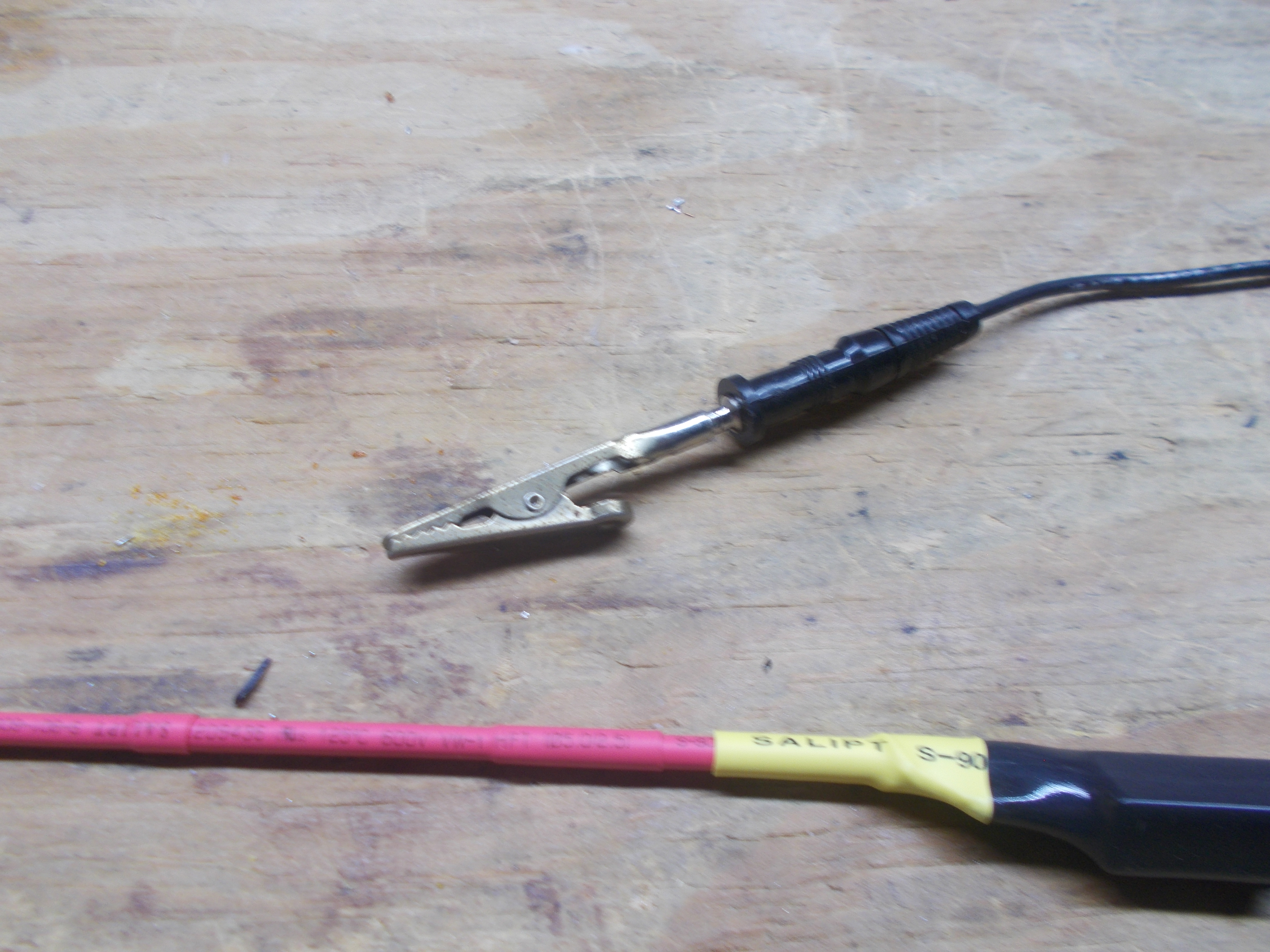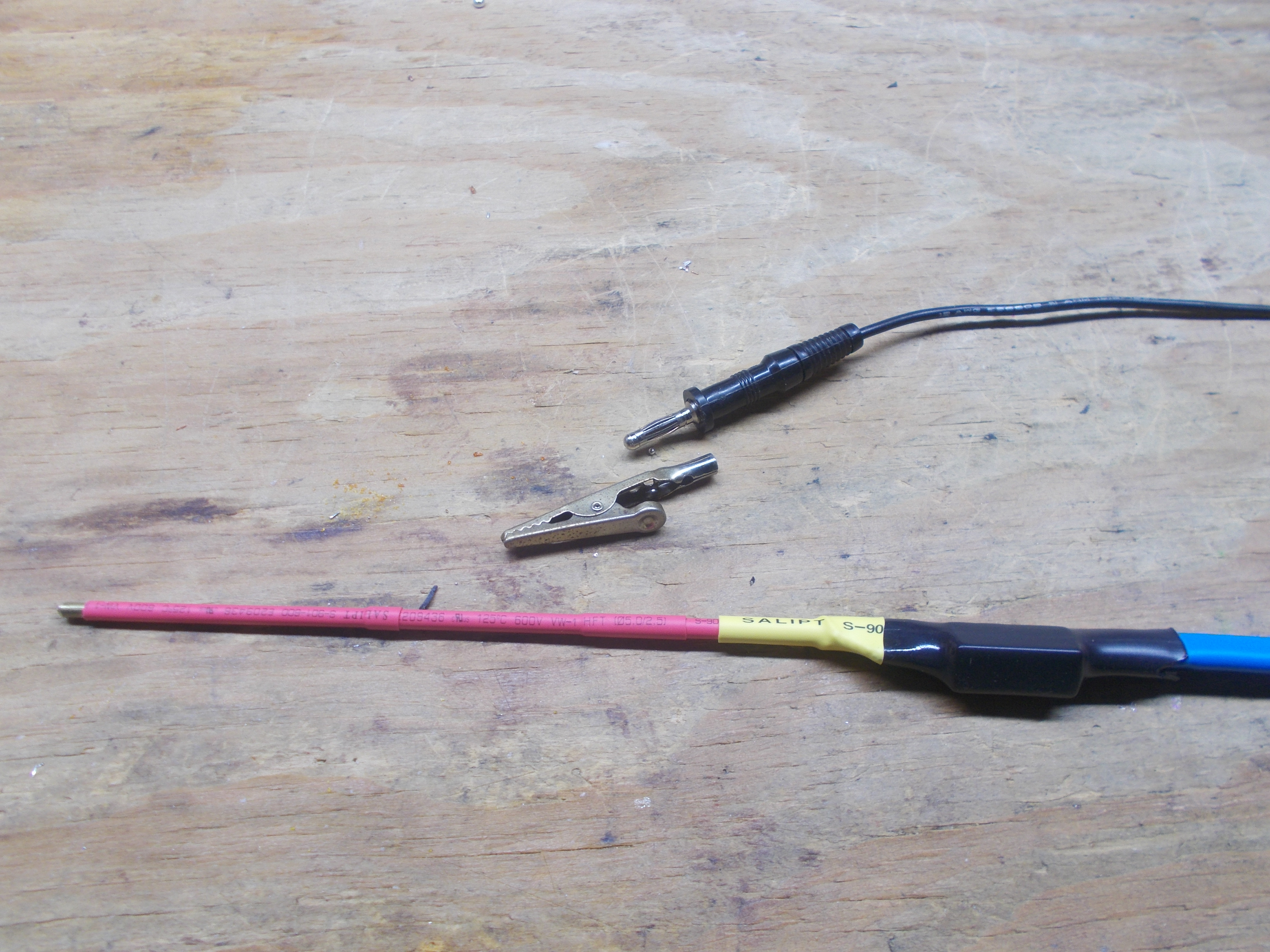 Brass rod ($4) from Lowes, 100K, 5W resistor, 1/4" banana plug, bare alligator clip (fits on plug) and LOTS of heat shrink