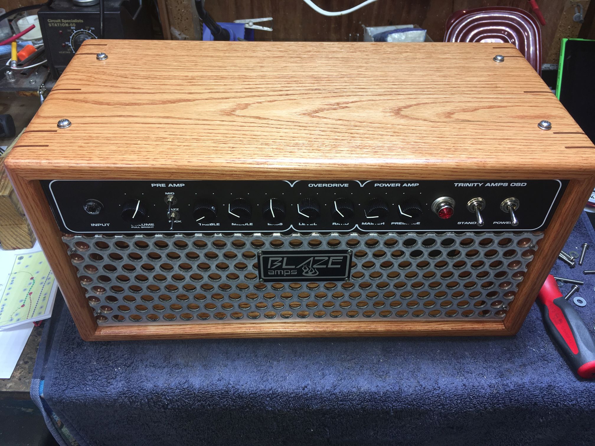 Ive been wanting to build a Dumble style amp for a long time for a long time, but with other builds going on and not being 100% confident in the documentation I was finding I always went on to other things. So when I saw Trinity was putting this kit together I knew it would be top notch and that this was my opertunity to build one. I went back & forth on building a head cab or a combo, I went with a head for flexability. I had everything I needed to build the cabinit so it was just a matter of getting the chassis in my hand to start cutting. Once that was done I went on to put the amp together. Of course the kit parts are top notch and the docs & info are second to none. As the build went along I did find a few things that could be improved on the build information and a couple differences between the layout & the schematic, which is understandable since this is a first generation kit available from Trinity. I did make a list of the things I found, a very small list maybe five things. As I went along I checked transformer voltages and the relay before moving on to the next step. When start up time came I did use a light bulb limiter when I first turned it on , just in case, & all was well. I biased the matched 6v6's to 22ma , documented all the voltages , All the B+ voltages were a few to 10 or so volts lower than what the chart showed but all well with in specs. The first thing I noticed after playing for a few miniutes, and its always the first thing I look for , is how quite the amp is. No humm, no hiss & even cranked with the overdrive engaged , there is very little extrenious noise. Always a good sign. Everything worked perfectly right from the start, all the controls, foot switch and toggles. The amp is an absolute joy to play, I am not an acomplished guitar player so I know that when I can make an amp sound good and when an amp makes me sound good its a great amp. Honestly this amp makes even my playing seem easy, everything I play sounds great & seems efortless. Another thing is the tone & feel of the amp at low volume! Fantastic, you dont have to disrupt the whole neighborhood to have a great sound & tone, clean & dirty. The clean tones are to die for and have a sustaining quality to them that other amps lack, the Overdrive is smooth and has a fantastic thick overtone quality to it. I could not be happier with the way this amp turned out and with the product & service from Trinity Amps. Thanks for everything. . Joe