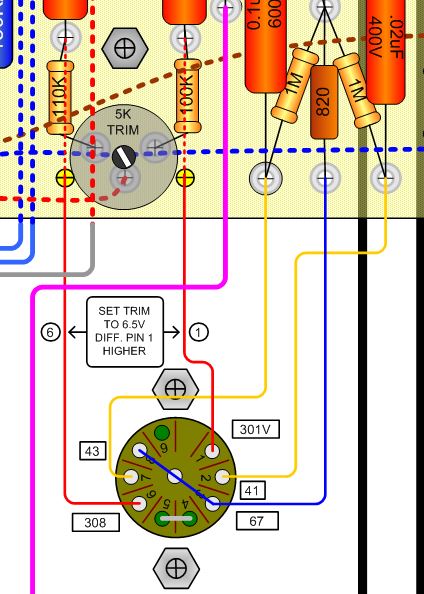 Use an insulated adjustment tool and be very careful of high voltages.The objective it to set the trimmer for a approximate 6.5 - 7 volt difference Pin 1 with the higher plate voltage.