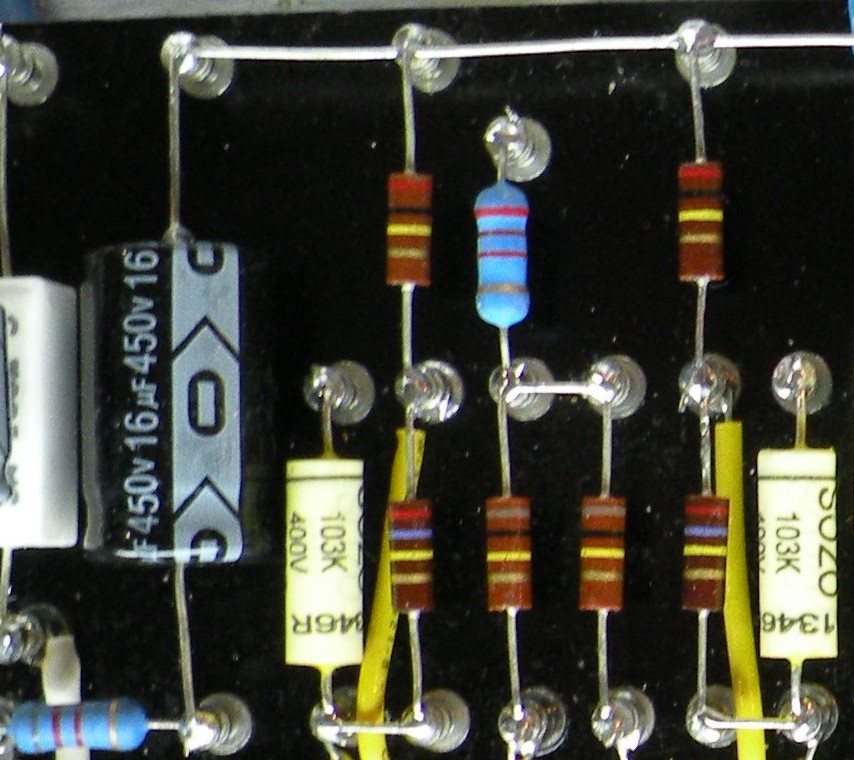 Here is V1. Notice that I used the four-tag terminals to make it easier to install the VRM coupling capacitors [and for the cascade mod that I will be installing (cascading TMB into Normal channel)]. I have not connected any wiring form the normal channel's coupling capacitor to pin 7 because that will take place with the cascade mod wiring later.