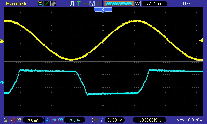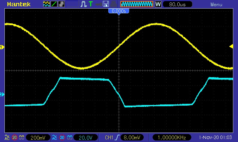 I implemented the Ruby mod, which nearly removed all of the crossover distortion. Because the highest cathode voltage I had recorded was about 25.5 VDC, I went with a 3 diode array: 20V and 6.5V zener in series (both 5 Watt) and back to back with a 1n4007. That was connected in parallel with each 220K grid leak resistor with the 1n4007 side going to ground. Some pics of both channels on my scope. This was the most prevalent I could make the crossover distortion with a SS rectifier. It is even less apparent with the 5AR4. Sounds much better now.
