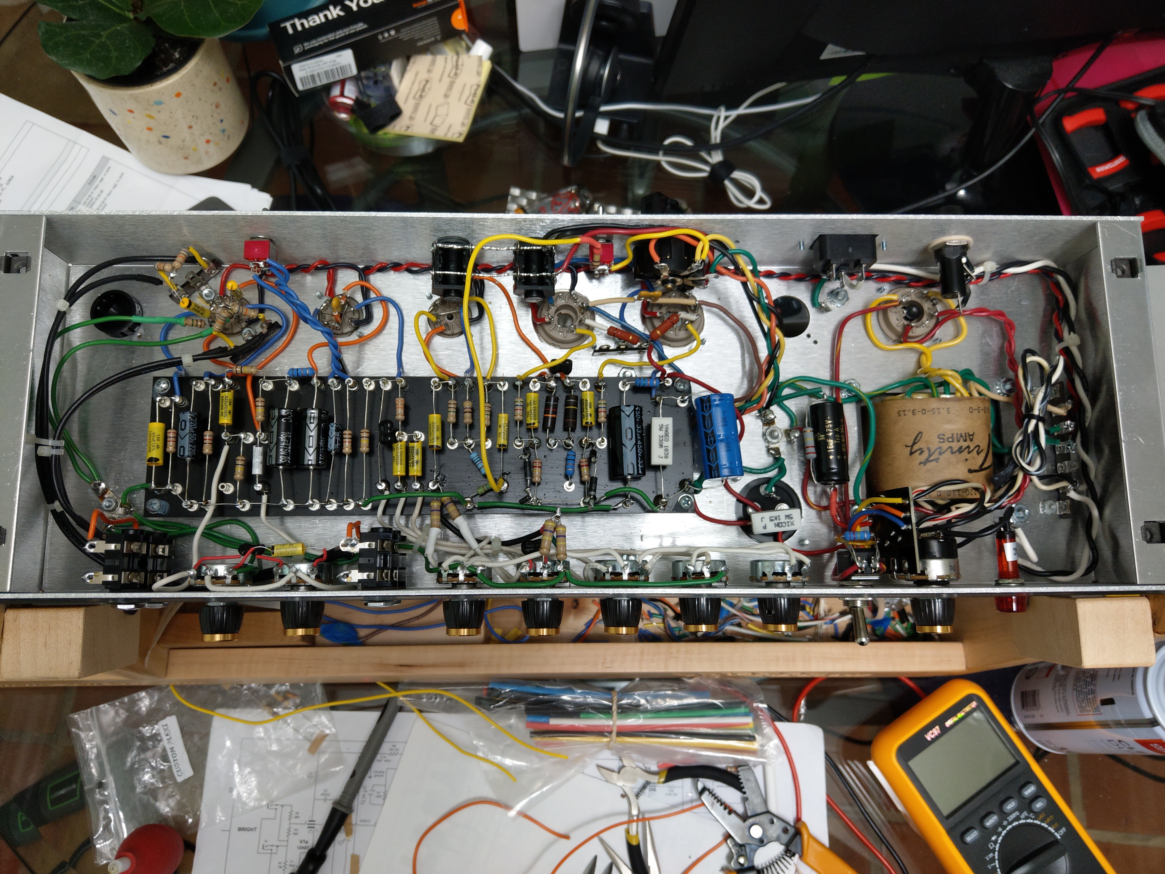 I am still considering reworking the amp to incorporate GNFB similar to what a real plexi would have. That requires several changes: channel mixing resistors and moving both channels to 1 input on the phase inverter, changing the tail resistor, adding the NFB resistor and feedback tail resistor, and phase inverter plates. Or if I don't do that, I may try to make the gain range more usable on the plexi channel. Maybe I'll be happy with it and leave it as is. Who knows....