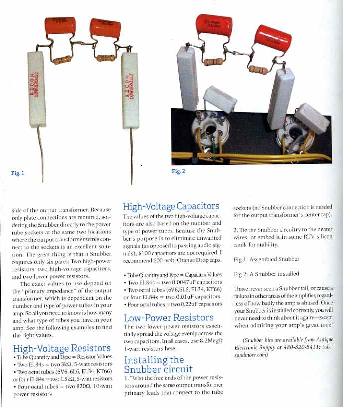 One more dumb question - this month's guitar player features an amp mod the author calls a "snubber" that sounds like it is intended to perform similarly to the Ruby mod - "creates a filter on the primary side of the OT to remove unwanted high frequencies while leaving the rest of the frequencies untouched" - lists two 3kilo ohm 5 watt resistors, two .0047uF capacitors, and two 8.2 megaohm resistors wired as in the picture below attached "to the OT primary leads that connect to the tube sockets"