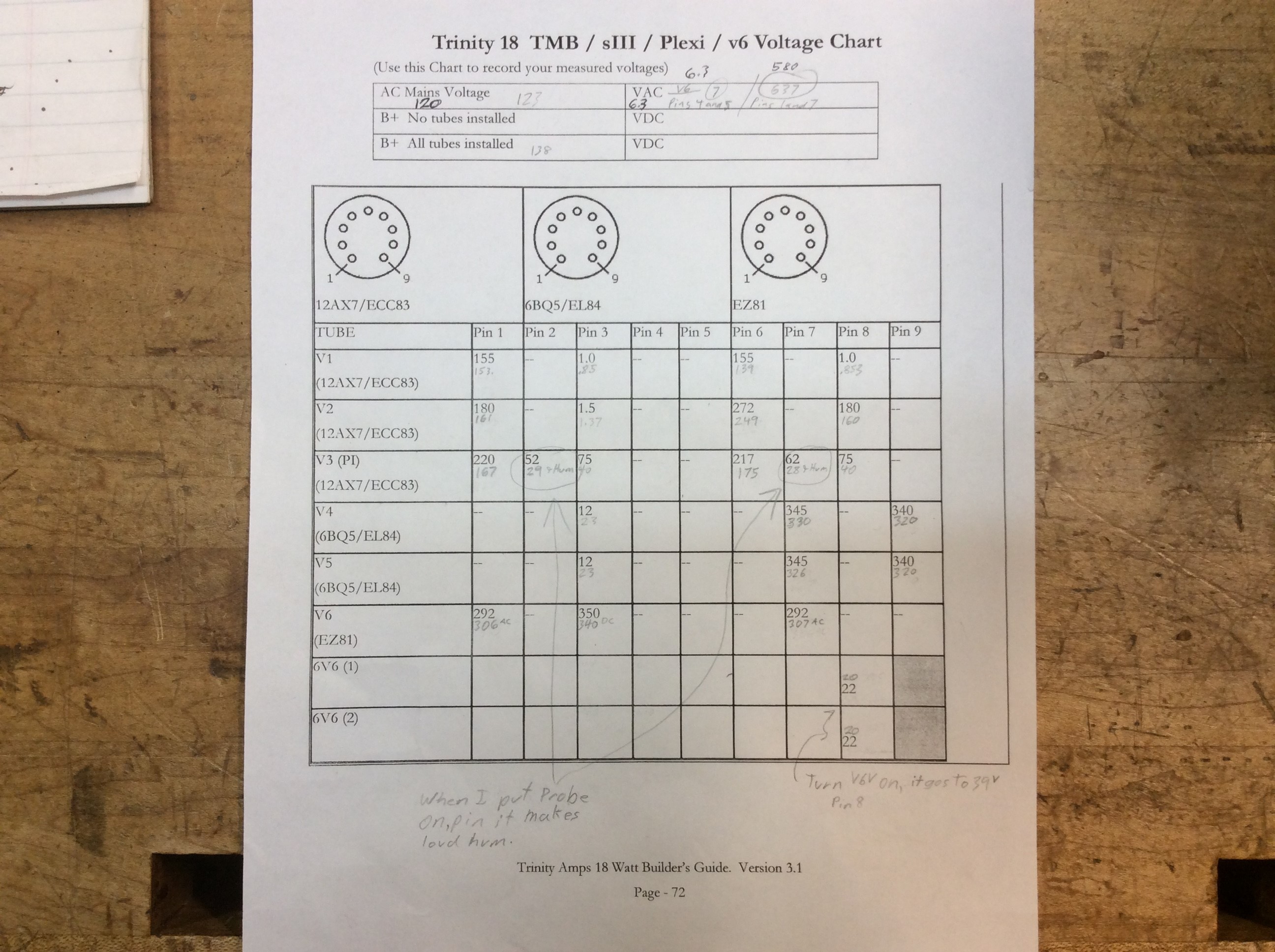 The layout diagram has an error on it. Those voltages 'bubbles' should point to the 100K plate resistors, not the coupling caps! Sorry about that. The caps will have zero voltages.
