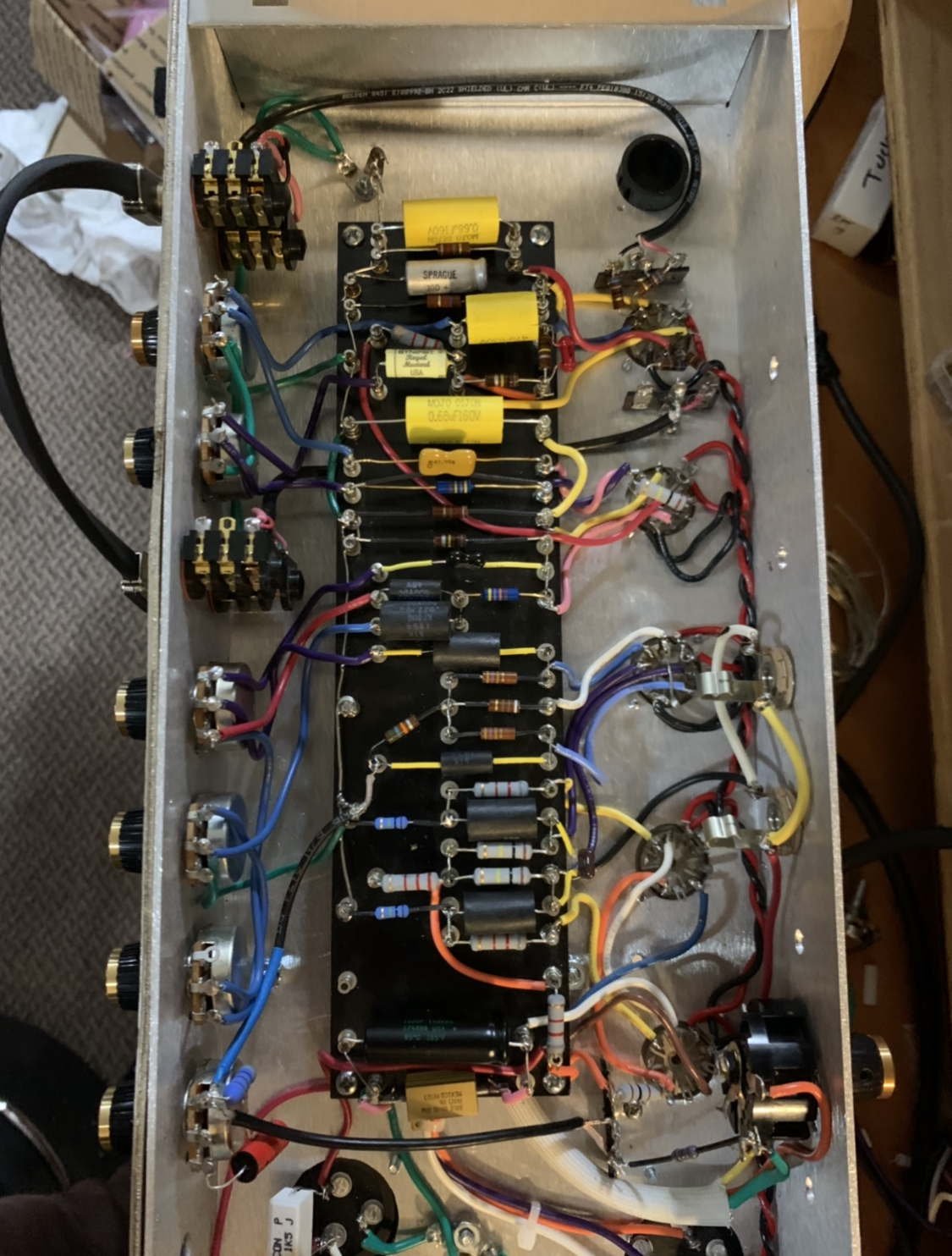 Just finished a super fun build on a trinity 18 watt platform. It borrowed very largely from the mkii circuit with an identical cathode follower and phase inverter, however instead of a normal and tmb channel, I made a normal and bright channel like a full size plexi, and had them mix before the CF instead of at the PI. I did however give V2 its own filter cap and also used a gz34 rectifier.