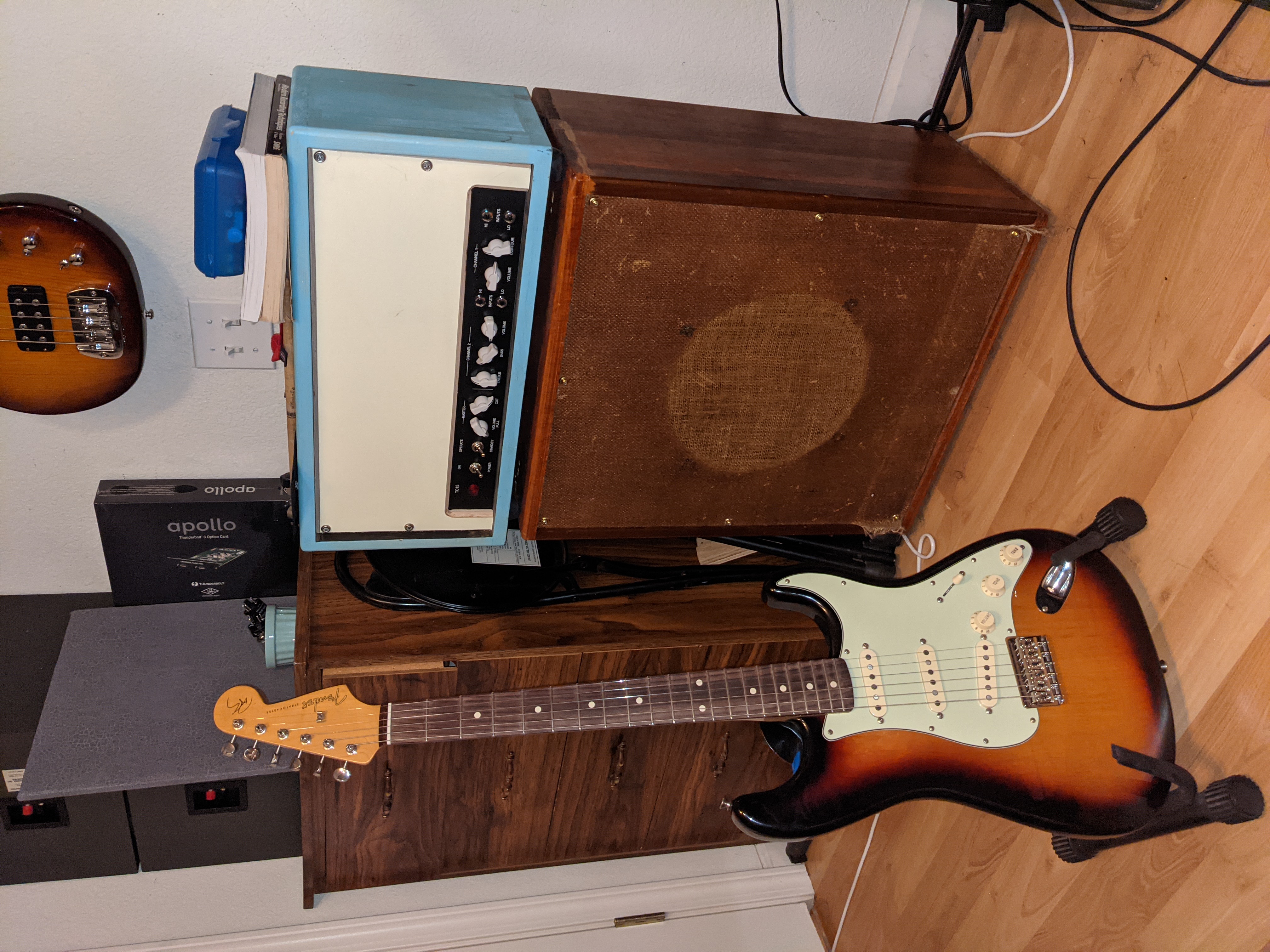 The cabinet here is an Avatar that I assembled back when they used to sell their cabinets in a flat-pack. It has a Scumback in it... can't remember the model for the life of me... lol. The amp underneath it is my "Simple 20b"... a modified Simple Preamp married to the 20W PP power amp from AX84.com (may that site r.i.p.)