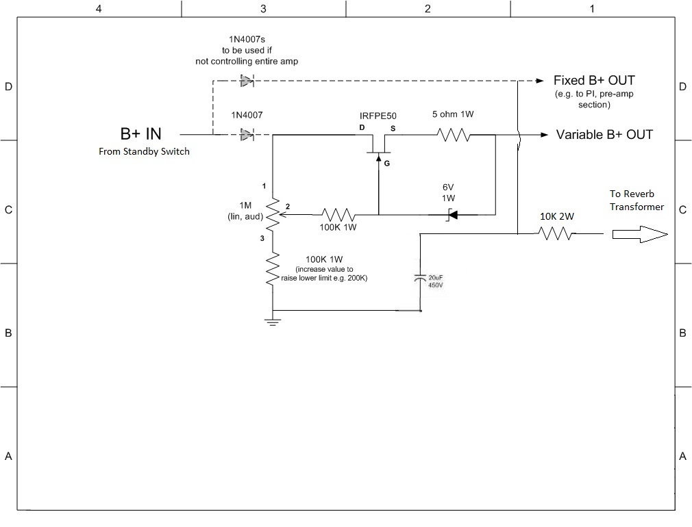 I'm in the process of fitting a VRM at the moment, but I think I'll need to supply the reverb with full B+ at all times. I was thinking of using a 10K screen supply dropping resistor after a 1N4007. My question is would it be ok to take the B+ from the Cap can through a 1N4007 suppling the VRM and through a separate 1N4007 into 10K screen resistor onto reverb transformer, or do I need an extra 22uf 450V cap tied to ground to do this?