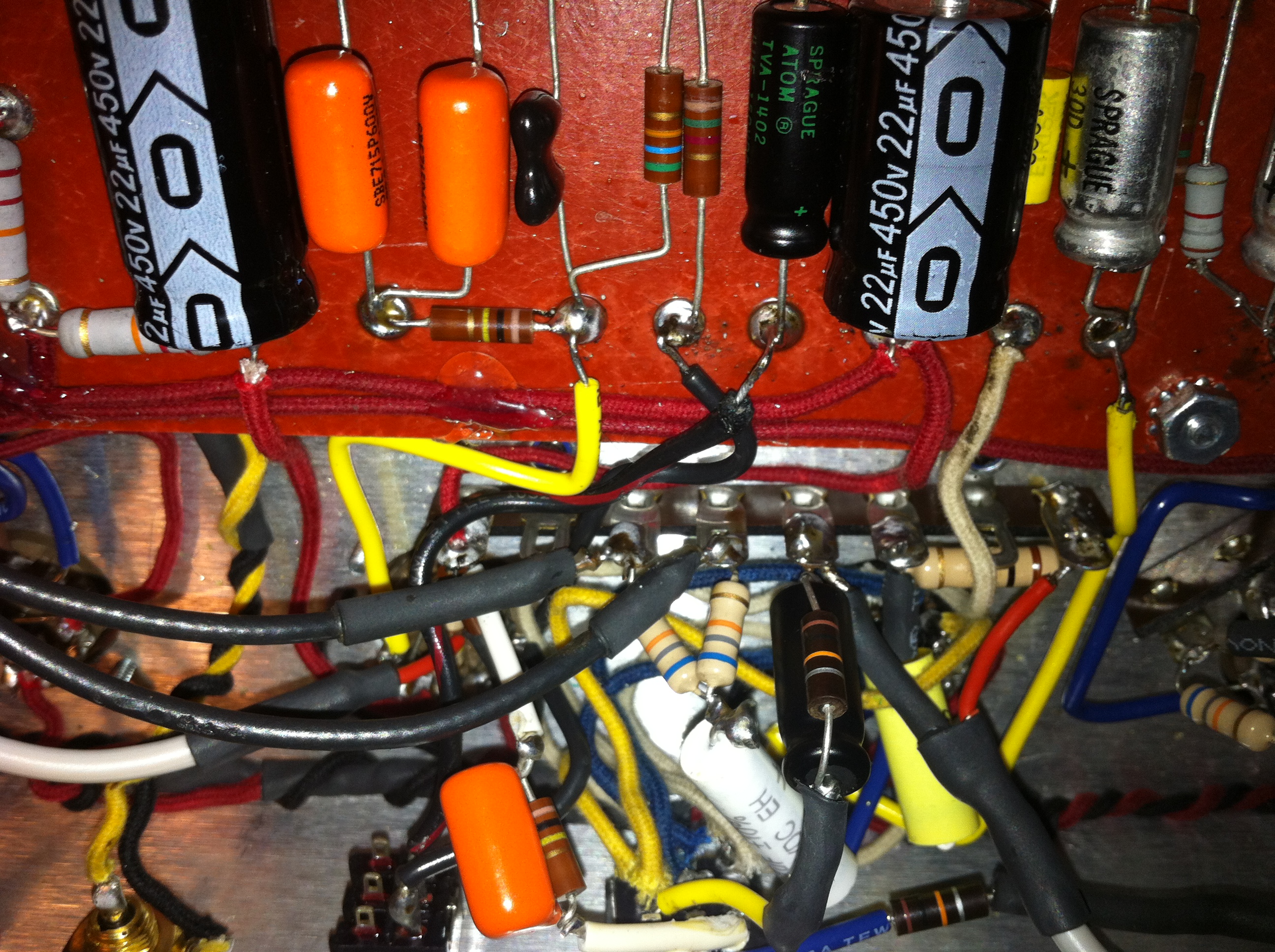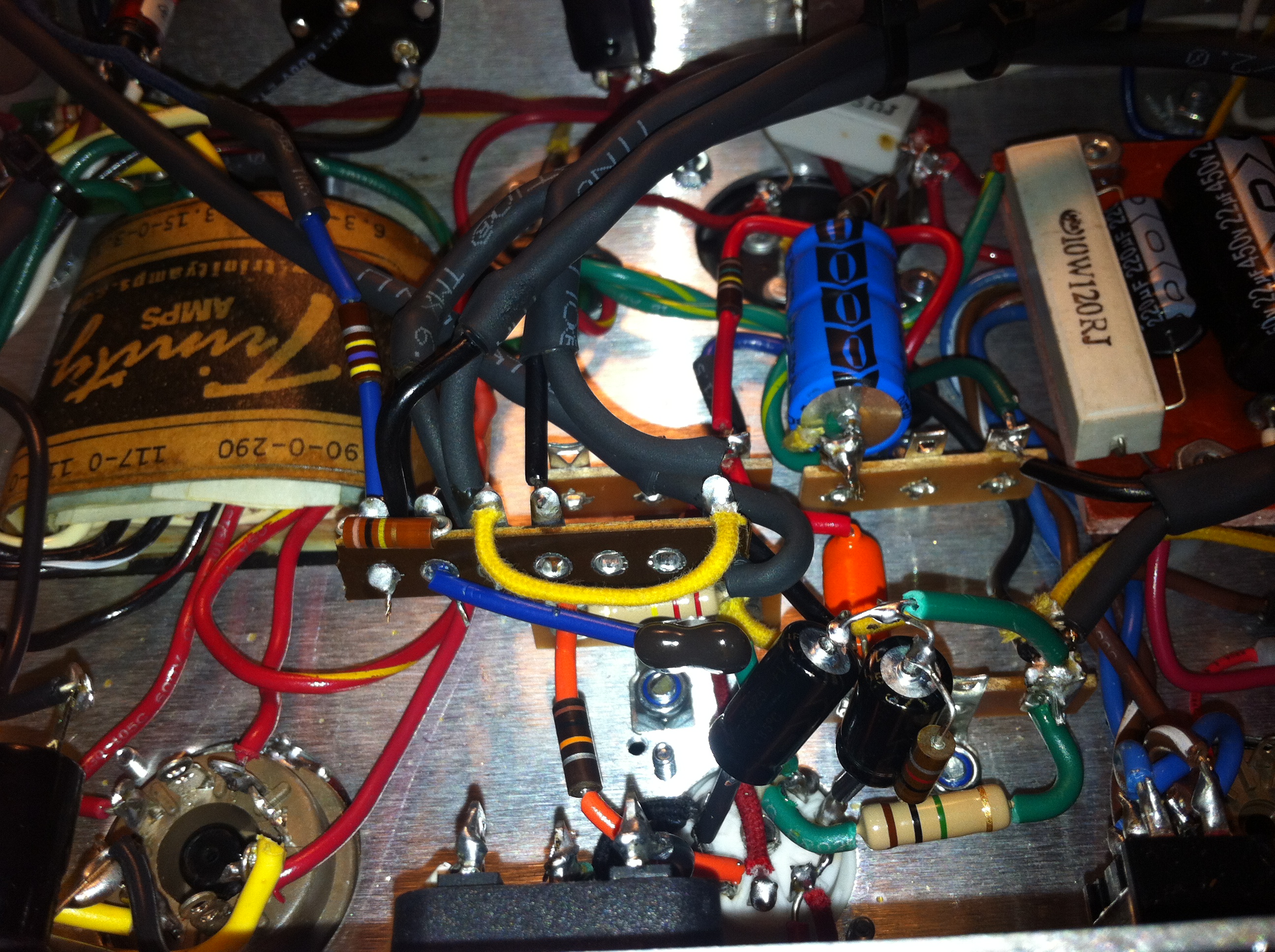I've made another change and added a switchable choke. The voltages on the triodes are 246V & 135V in resistor mode and 305V & 166V in choke mode. I moved the input to the wiper and returned the 220k and 100k to stock like you said, the tone controls do work better this way. Also did some tidying up, check the pics and let me know what ye think.