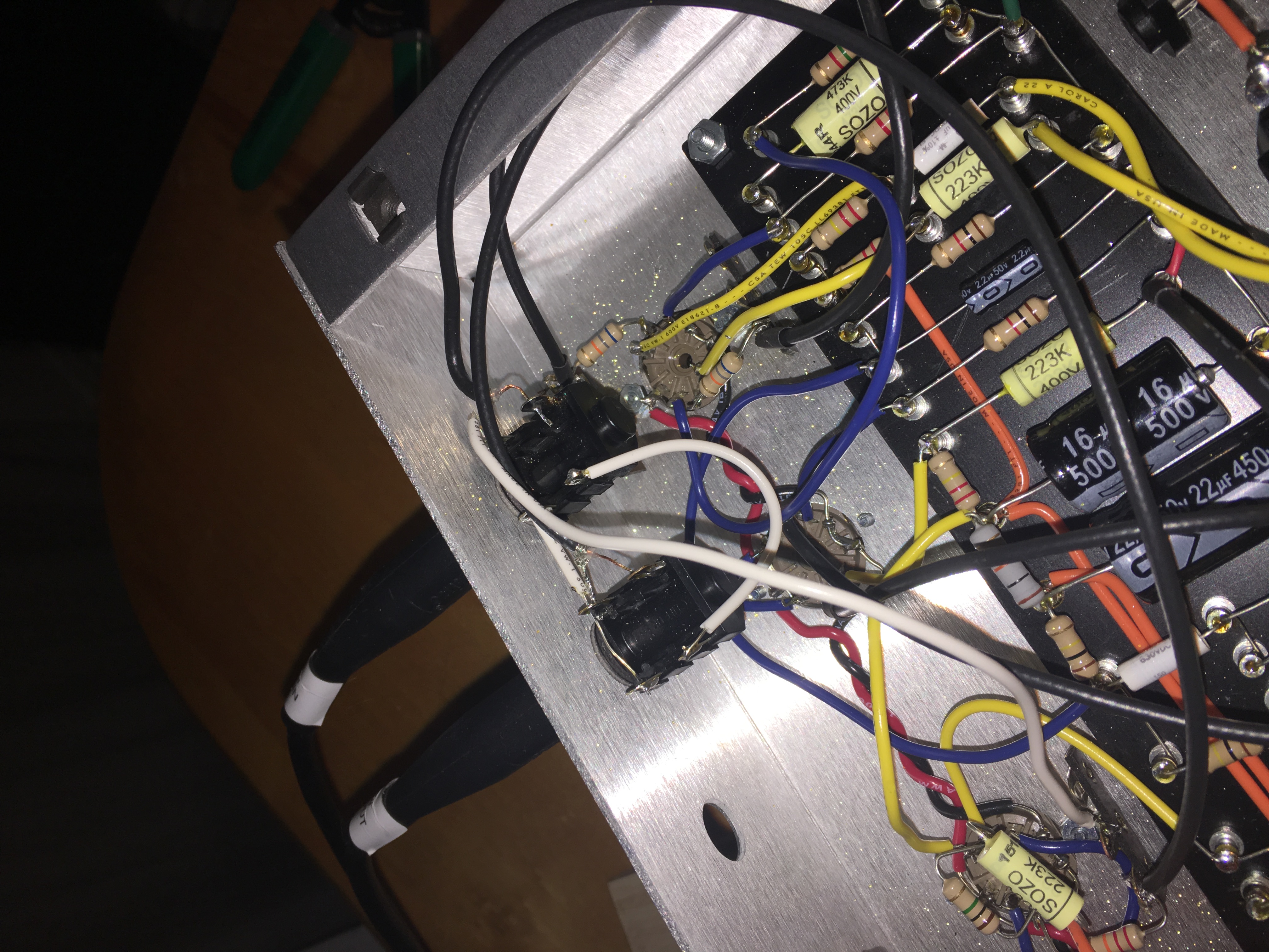 To accommodate the send & return jacks in the chassis I plugged the hole for one of the speaker jacks (the one nearest the OD footswitch) and drilled two new holes just above and just below that plugged hole. Works well, and places the send and return jacks in exactly the right place to have the shortest cable runs possible.