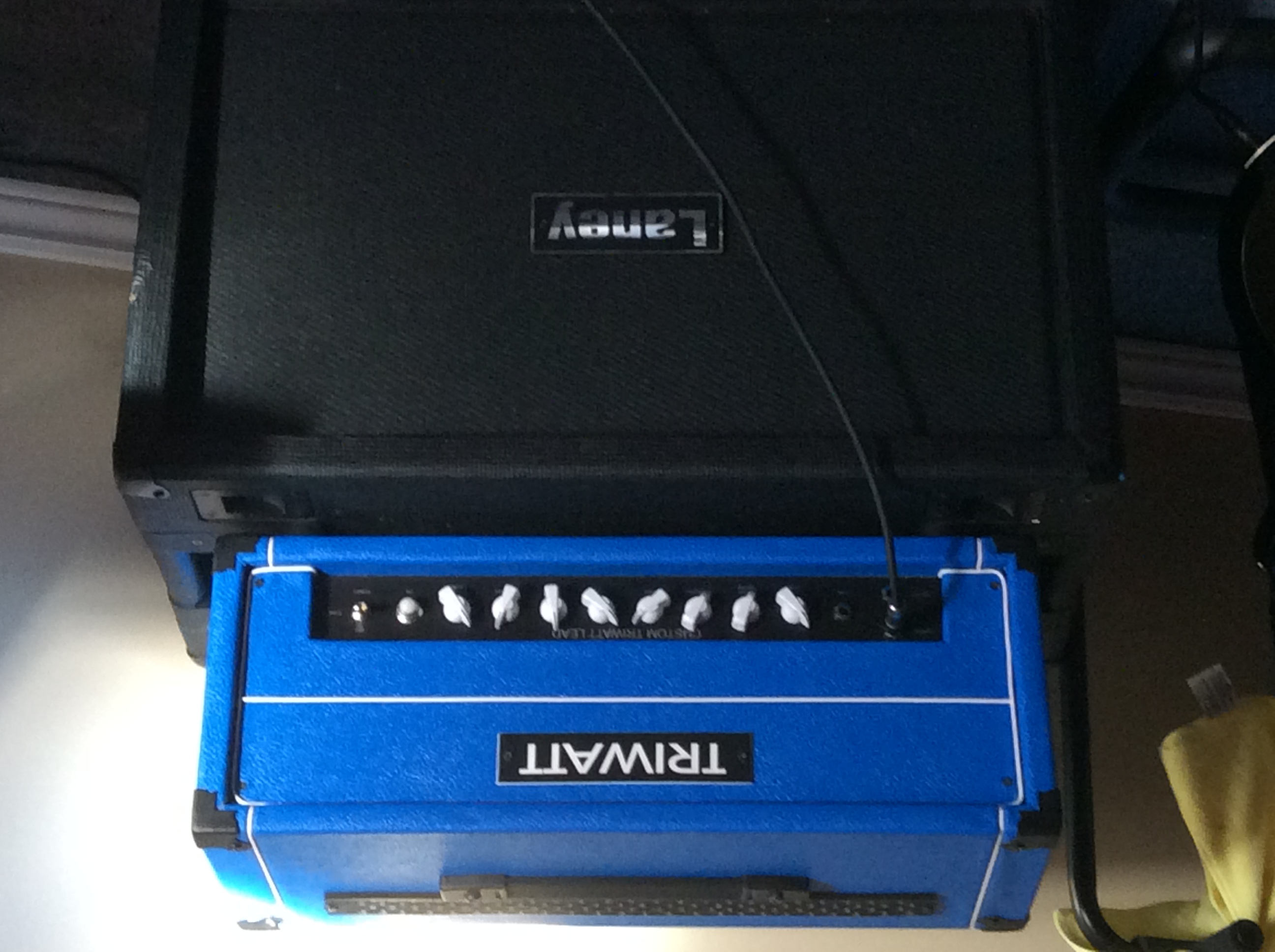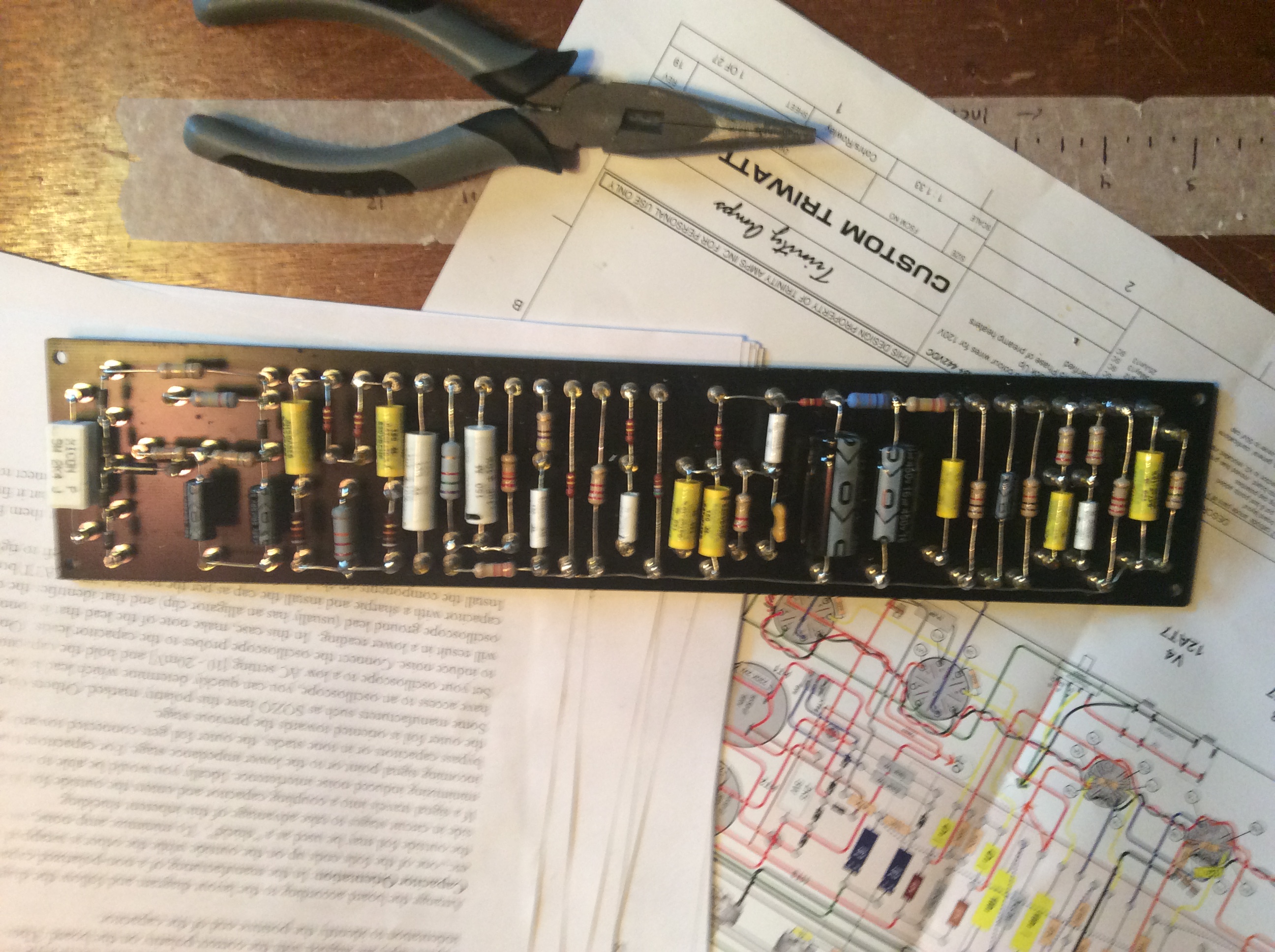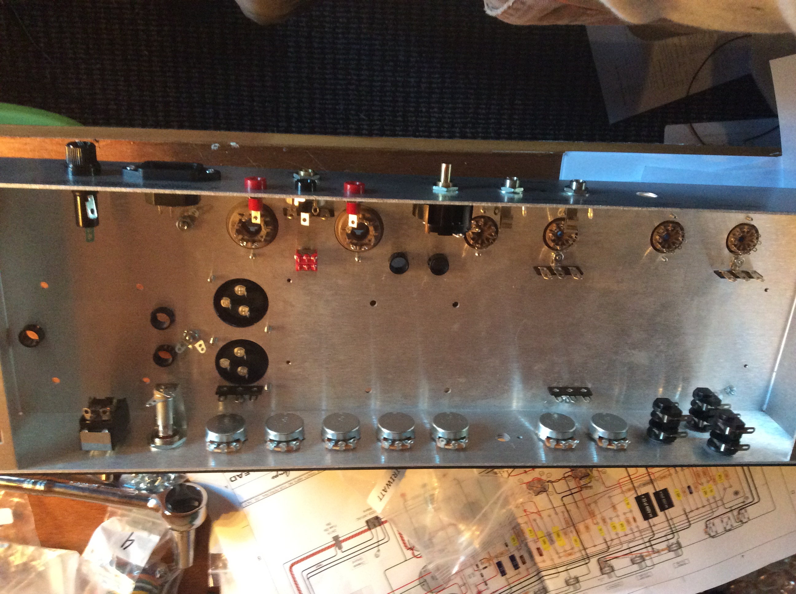 Hey guys just wanted to throw on some pics of my Triwatt build this winter, the forum is a great resource and the more pics the better I think. I went through almost every posting on here before I built this amp and it helped a lot. Just wanted to thank Stephen for everything I have built the trifly, tramp and now the Triwatt and if anyone is thinking about getting a trinity amp ( do it) they are the best! I started building amps because when I moved to my new house 2 years ago I had horrible buzzing coming from my amps, after getting electricians and power company guys here to look at it (they couldn't find anything) with the help of a music tech friend we found it to be a RF noise that really couldn't be helped even with shielding my guitars and everything else. What I did notice was that some amps were much better than others which made me wonder if a more expensive amp would perform better but I couldn't really afford it. So I decided to build a trinity amp and never looked back, no real noise to speak of at all and I couldn't be happier. I will be back for more in the years to come I eventually want to build the 18 watt and tc15 all these amps are so awesome! The tramp offers endless sound options with the push pull knobs and all the different tubes you can use and the Triwatt with the kt66s is the best amp I've ever heard! So here are a few pics they aren't great quality I just took them in case I ran into trouble.
