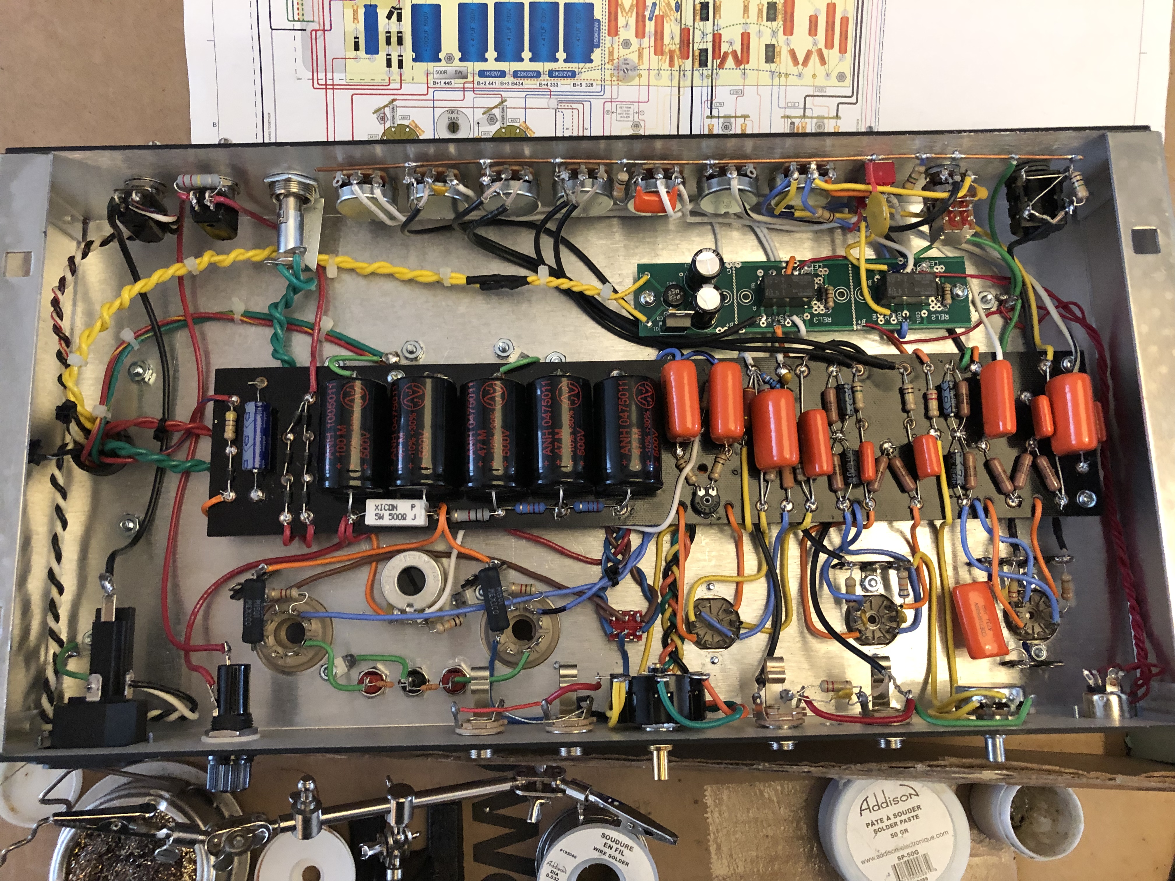 I’ve been moving very slowly though the kit. Here’s where I’ve ended up today. All done except for the heaters and the foot switch. So far so good (I think!). The only hiccup I ran into was that I found it difficult to complete the connections on the jazz/rock and mid boost toggle switches with components already mounted. I ended up stripping some off to get better access to the terminals then re connecting everything from the bottom up.