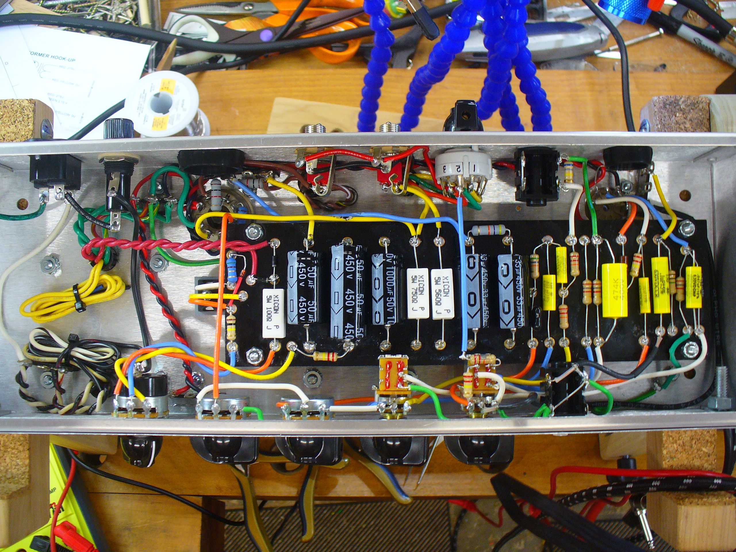 Had a few issues but by following the guide, spending quality time with the schematics, reviewing pretty much all of the Tramp forum posts and taking the time to not kill myself I got her done. She's hooked up to a 12" Celestion Gold 8 ohm speaker.
