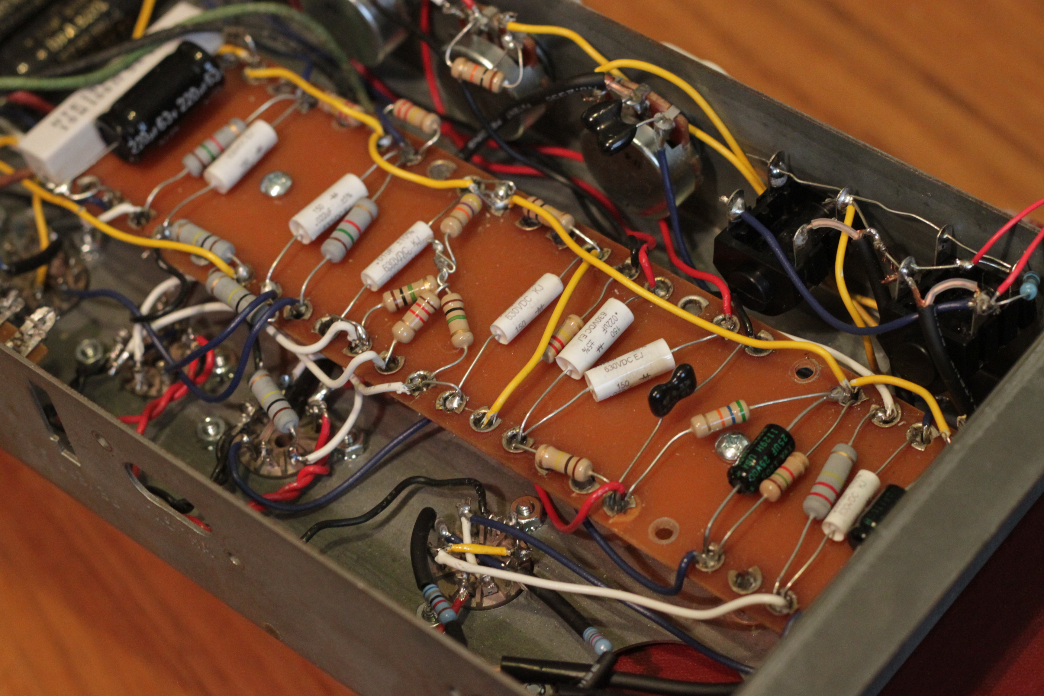 I used metal oxide resistors in quite a few places, just to be safe (following the Trinity schematic notes). I wonder how much tonal difference there would have been if I had placed a few carbon comps in there somewhere.