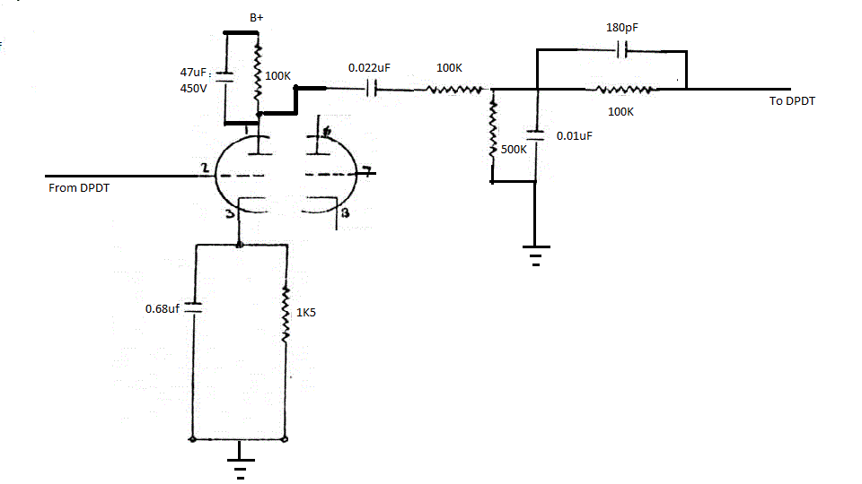 paralleled with 0.68uF cap. Then use a coupling cct to reconnect to V2. See attached schematic. I may be way off the mark, I've a good bit of electronics experience but I'm fairly new to valve circuits so please correct me if I'm wrong! :) (using 12ax7 so as I can use the other half of the valve to boost channel 1)
