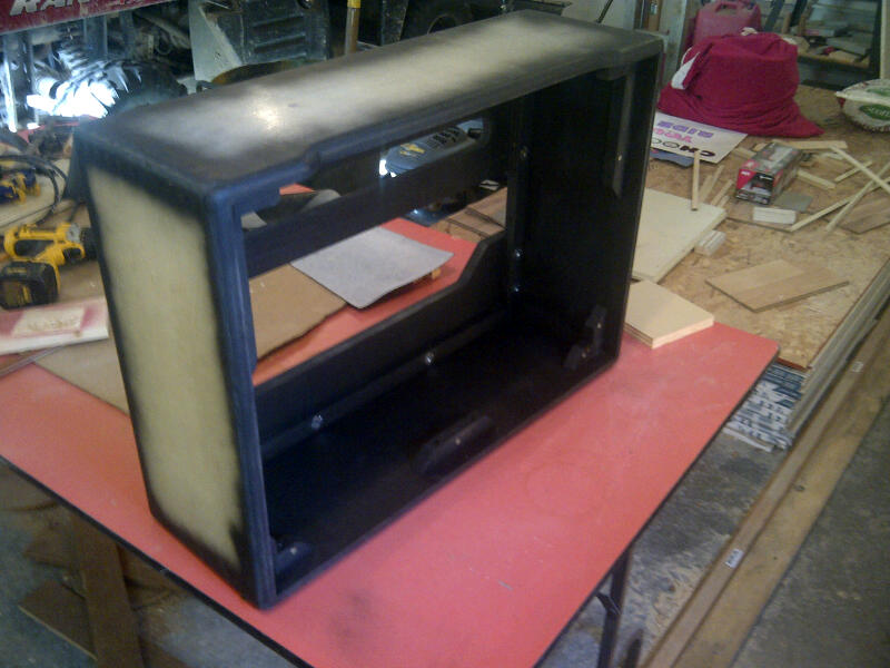 Here's pictures of chassis almost finished and new faceplate ($25.00 cash at local sign shop - he got it fairly close) and cab in process. Tolex. grillcloth and speakers should be here by weekend so we'll see how it goes. Never tolexed before but how bad can it be!