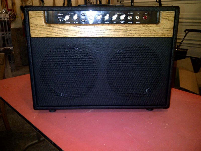Here it is. Sorry, pictures are sad. Not a super original design but I really wanted a 2x12 combo that I could carry with one hand. Cab is some 3/4" weird 9 ply plywood from 40 year old kitchen cabinets I had but was straight, flat and voidless (I tapped every piece) and has what I think is a nice firm woody sound. Finger jointed and braced so should handle 2 12" speakers and some lugging around.