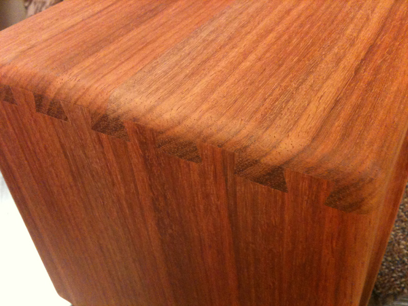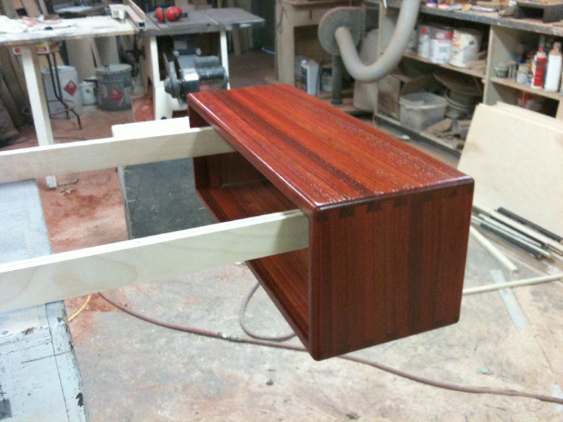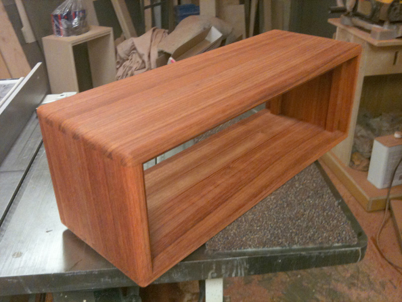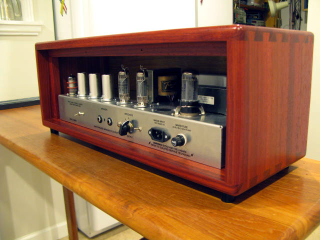 Here are a couple of pictures of the finished amp. I built the cabinet out of solid African padauk wood. I'll post a couple of more messages with other pictures taken during the build, too.