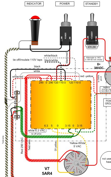 In the builder's guide section about the 240V hook up, it says to run a wire from the tag where the black and red-white trany leads are connected, to the pilot light. BUT this is NOT drawn in the accompanying layout pic, AND looking at the schematics, doesn't make any sense to me. Kindly advise a poor noob who has only built one amp previously. Thanx.