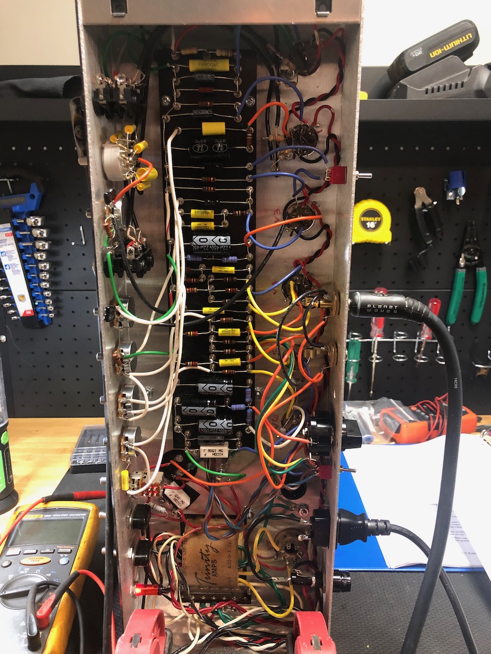 I have just completed my second build (first one was a Trinity Tramp). My TC 15 looks great (ok, maybe not as clean as some, but not bad). However, there is a lot of noise (crackling, popping) that sounds like its coming from channel 2. I'm at wits end at this point as I have tested and retested pretty much the whole build and haven't tracked down the issue. Voltage readings are normal on all the test points except for two - on the third terminal of the treble pot where it is supposed to read zero V, I get a full 25 V. I have tested the treble pot itself and it appears fine as it will go from zero all the way up to 1M ohm. I have also tested all the resistors and caps in channel 2. If I turn down all the pots on channel 2, I can use channel one with minimal noise (I can still hear it coming through a tiny bit). I also get a slightly high voltage reading at the 220k resistor just off pin 1 of V2 (156 V instead of 137 V). I think this may be due to my big cylindrical power cap having a slightly high capacitance on one side (42 mf instead of 32 mf). I also notice a bit of bleed through on the amp when it is on standby (I can still hear a tiny bit of signal coming through the speaker with standby on).