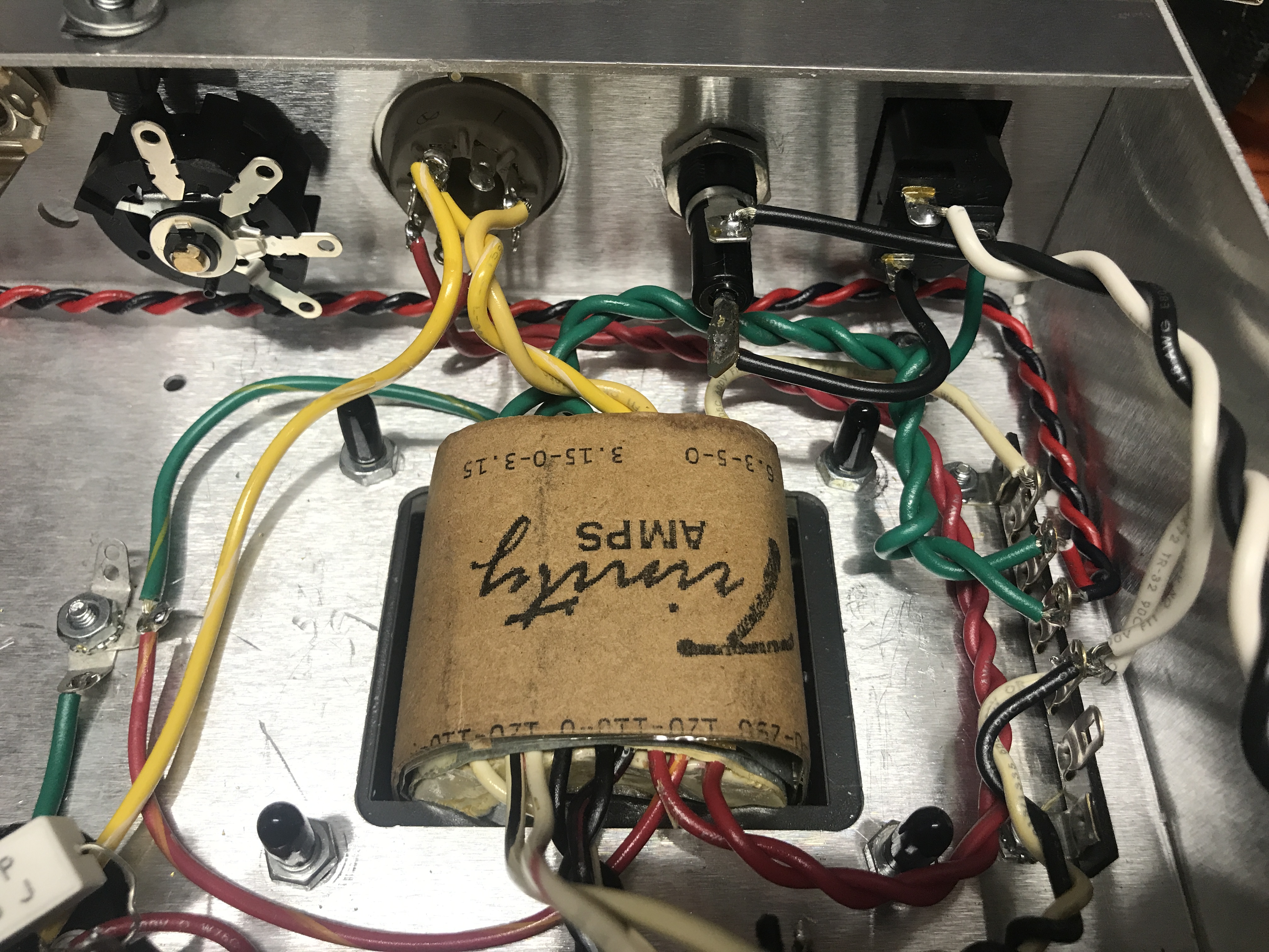 Cut that white wire off of the terminal strip that says 6.3V and shrink tube end off and tie out of way. I looked at my amp photos and though is hard to tell from layout unless looking close should be to a 'dead' terminal on strip or cut and isolated. Once I looked I remember that I had accidentally put on grounded terminal and turned on amp but it never hurt anything like you are experiencing. Do it anyways cuz Stephen said so.