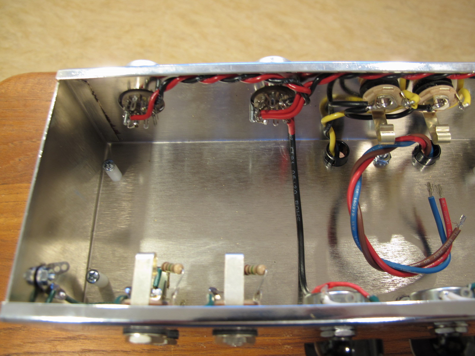 All that was left now was to attach the flyoff wires coming from the eyelet board to the tube sockets, pots and jacks.