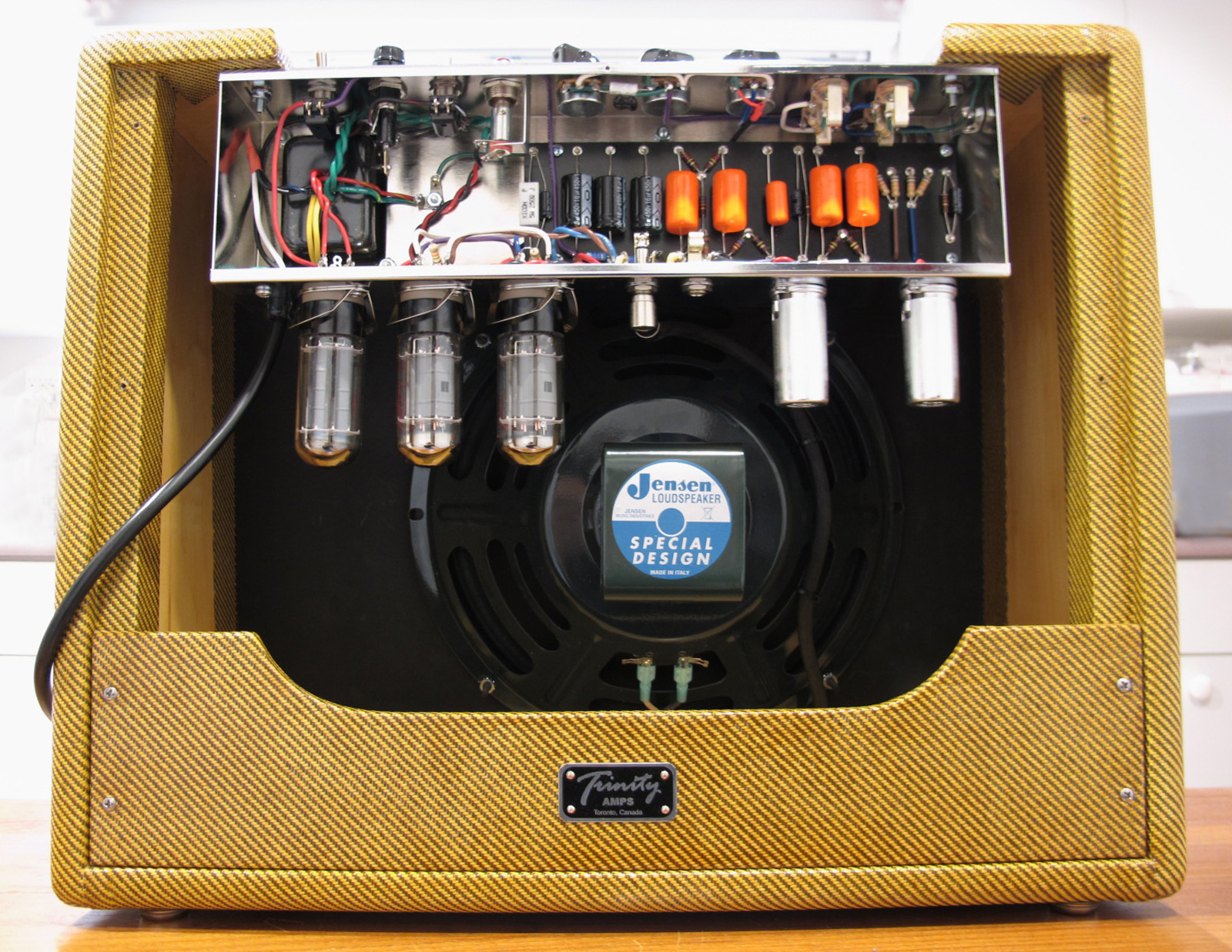 I powered it down, waited for the capacitors to discharge, then I plugged in the power tubes and a dummy load. I applied power again. All the tubes glowed normally. There was still no smoke, no signs of red plating on the 6V6's and all the voltages were good. I powered it down again and plugged in a speaker and a guitar for the first time. I fired it up and it worked like a charm!