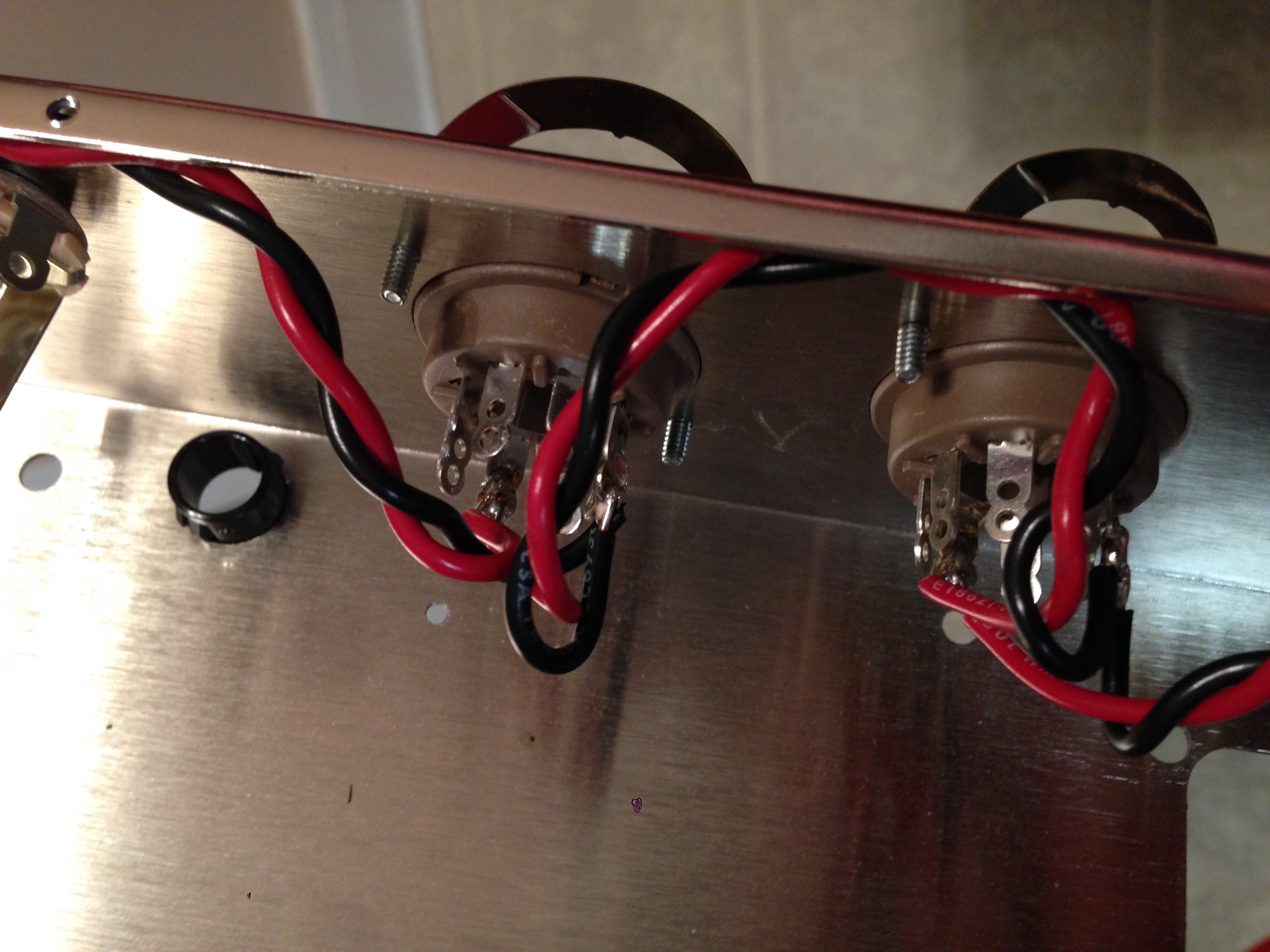 Now, as to the .02µF cap, the reason we haven't wired that up yet is because the cap I have reads 2.22 nF. Now I know my math isn't great, but I'm pretty sure that would be .002µF, not .02µF... I double-read the layouts and the schematic, and it really does appear that it need a .02µF, so unless I'm missing something obvious, I was shipped the wrong cap... The markings on the cap show "SBE 715P 600V" on one line and "222J 0732" on the next line. If I'm reading that right, then the "222J" part means 22*100pF == 2200pF == 2.2nF == .0022µF, which is exactly what I'm reading with the multimeter, so it really does seem like I was shipped the wrong cap. When I went through and took inventory of the kit that was shipped to me against the BOM, I saw .022µF/600V, and saw the "22" and "600V" on the cap, and assumed it was right. I should have measured them all (although everything else other than the switch seems to have been right). I've notified Stephen, and hopefully he'll be patient with me...
