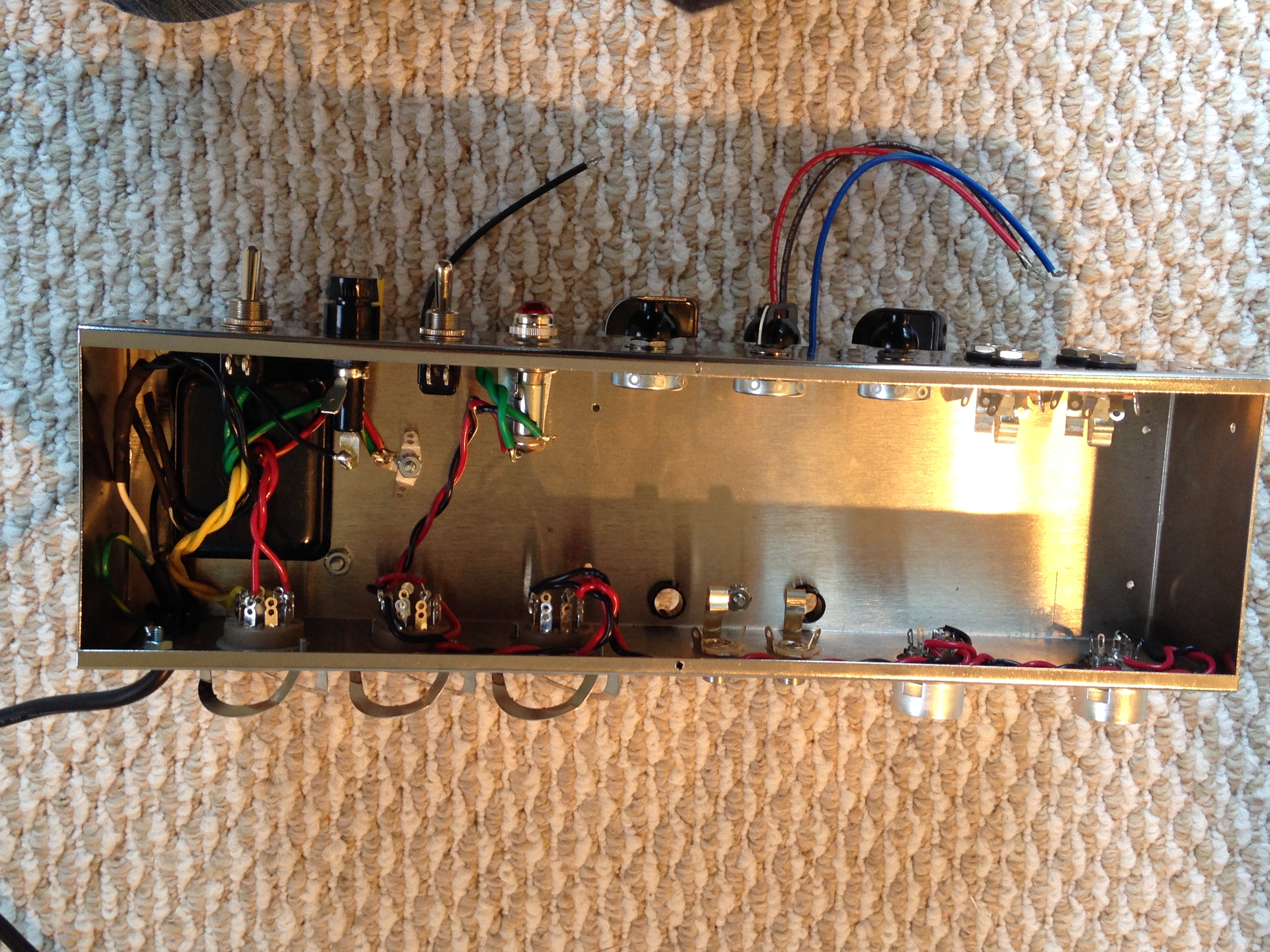 I also got all the PT hookups done, and wired up the OT to the power tube sockets. The rectifier is now done, and the tube sockets are all done, save for the connections that will come from the board.