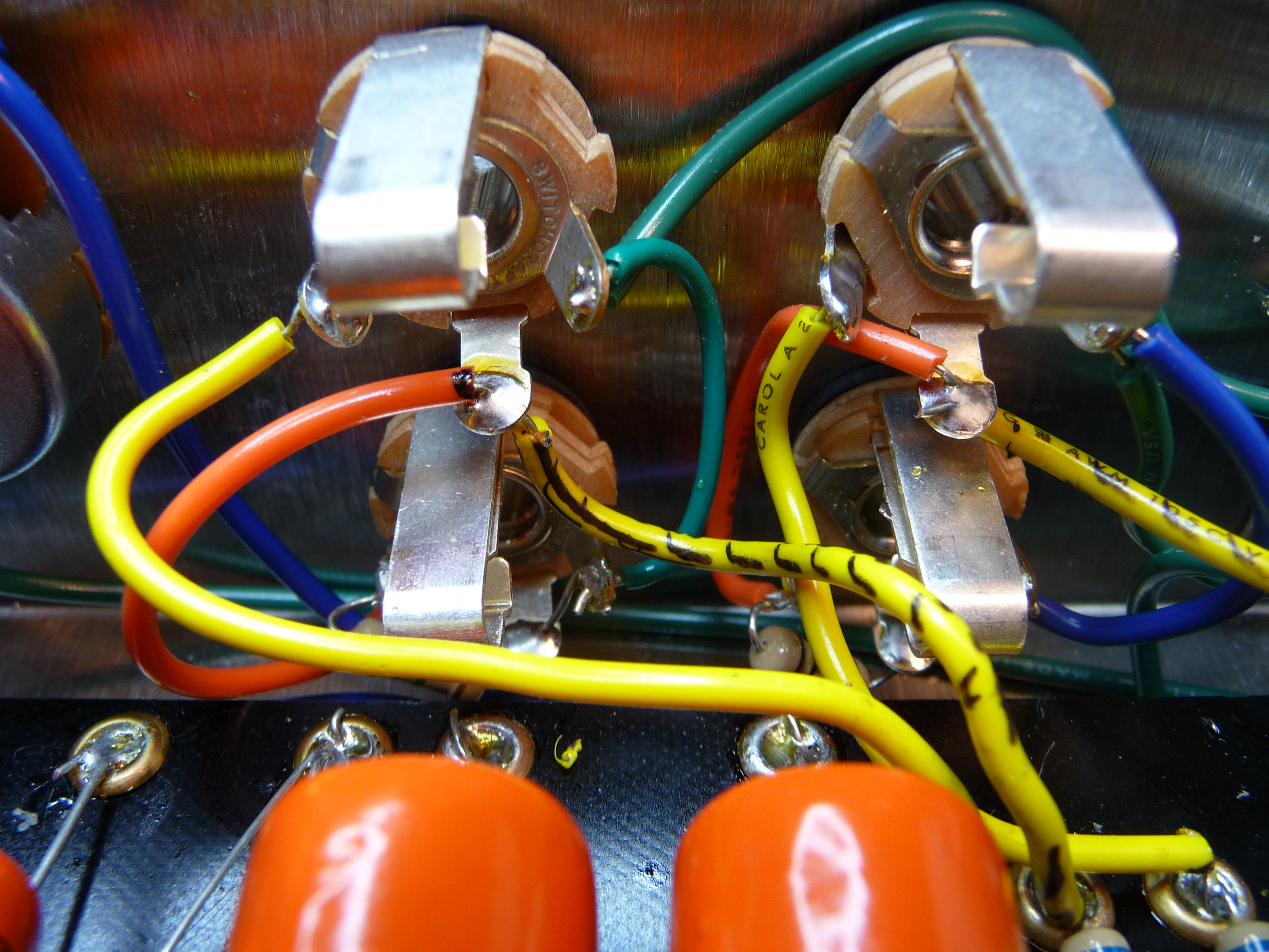 Normal channel has a pronounced hum without an instrument plugged in. Adds a significant hum when turned up while plugged into bright channel. When plugged into normal channel, on Hi input, significant buzz and some nasty raspy noises at moderately high volume. No rasp in the Lo input. Poking around with a plastic implement, yellow wire on pin 7 or V1 is microphonic, as are the yellow leads coming from the 68k resistor pairs. Grounds all seem to be ok for continuity. Before I start remelting things, some wise input would be much appreciated.