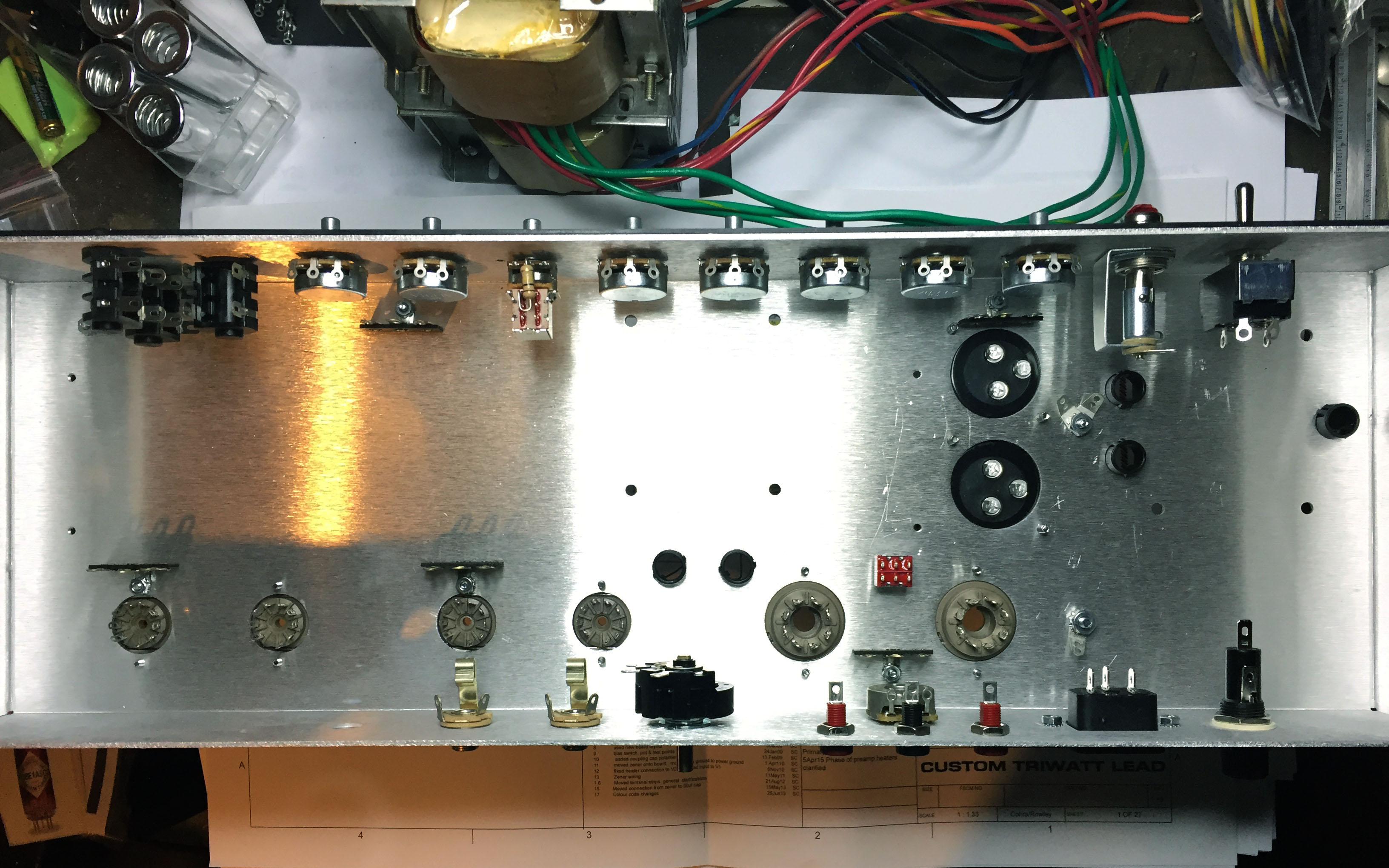 Just starting to dig into a TRIWATT build. Populated the chassis, the manual says 6 terminal strips, I can only see 5 on the wiring diagram. Seems perhaps one was removed from the other side of V1 in this design, revision 19? Any thoughts on input jack orientation? I've set Normal and Bright inputs horizontal and the Link input vertical because that seemed like it would be easier to wire Normal and Bright that way. Looking forward to the rest of the build.
