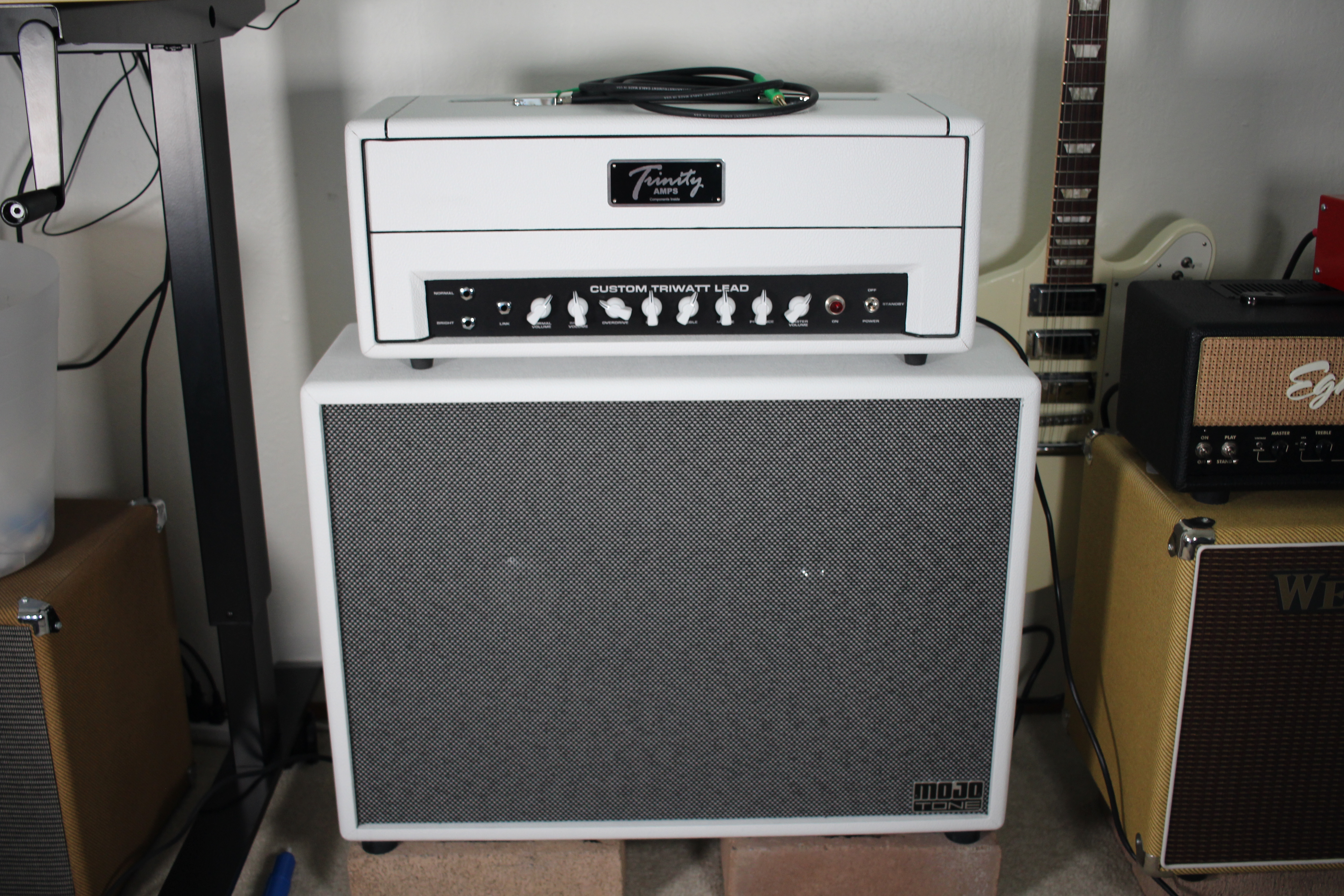 The amp sounds great with my (W)eber FC12, but I have a host of other options I'm looking forward to trying and reporting on in the appropriate topic. Once I install the replacement resistor, I'll take more comprehensive internal shots. For now I'll leave you with a shot of the righteous cab that Stephen made for me (sitting on a very expensive stand...matching white 2x12 speaker cab to come!) and a quick-and-dirty internal shot.