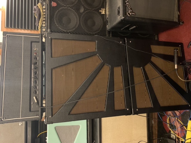The 25” square Cabinets are stereo or mono using Plug and Play jack plates. Each cabinet has a 12” ceramic BBQ Thames and a 10” ceramic BBQ Thames mounted diagonally so that any combination of speakers can be on the outside when the cabinets are side by side. The face of the cabinet is based on a design by Conrad Sundholm of Conrad Amps. The rays cross through the center of each speaker theoretically dispersing the high frequencies. It’s a floating baffle design, but I used 3/4” plywood instead of 1/2” since I was putting 2 speakers in it and I wanted some characteristics of a fixed baffle design.
